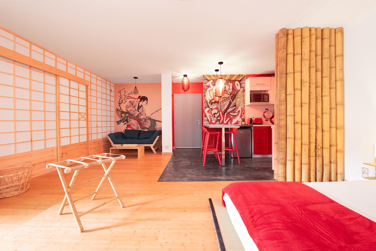 A 10 minutes à pied de l'hyper centre.Logement de 26m2, deux pièces au 1ere étage et une Kitchenette toute équipée au rez de chaussée. Jacuzzi, Sauna extérieur utilisable toute l'année privatif et sans vis à vis(réservé aux adultes) en supplément. Leurs réservations se fait à la journée avec un supplément de 20 euros par nuit et par personne.L'accès à la piscine est réservé aux propriétaire. Wifi, Netflix. Aucune place de parking, possibilité de garer les voitures dans une rue à 50m de la maison