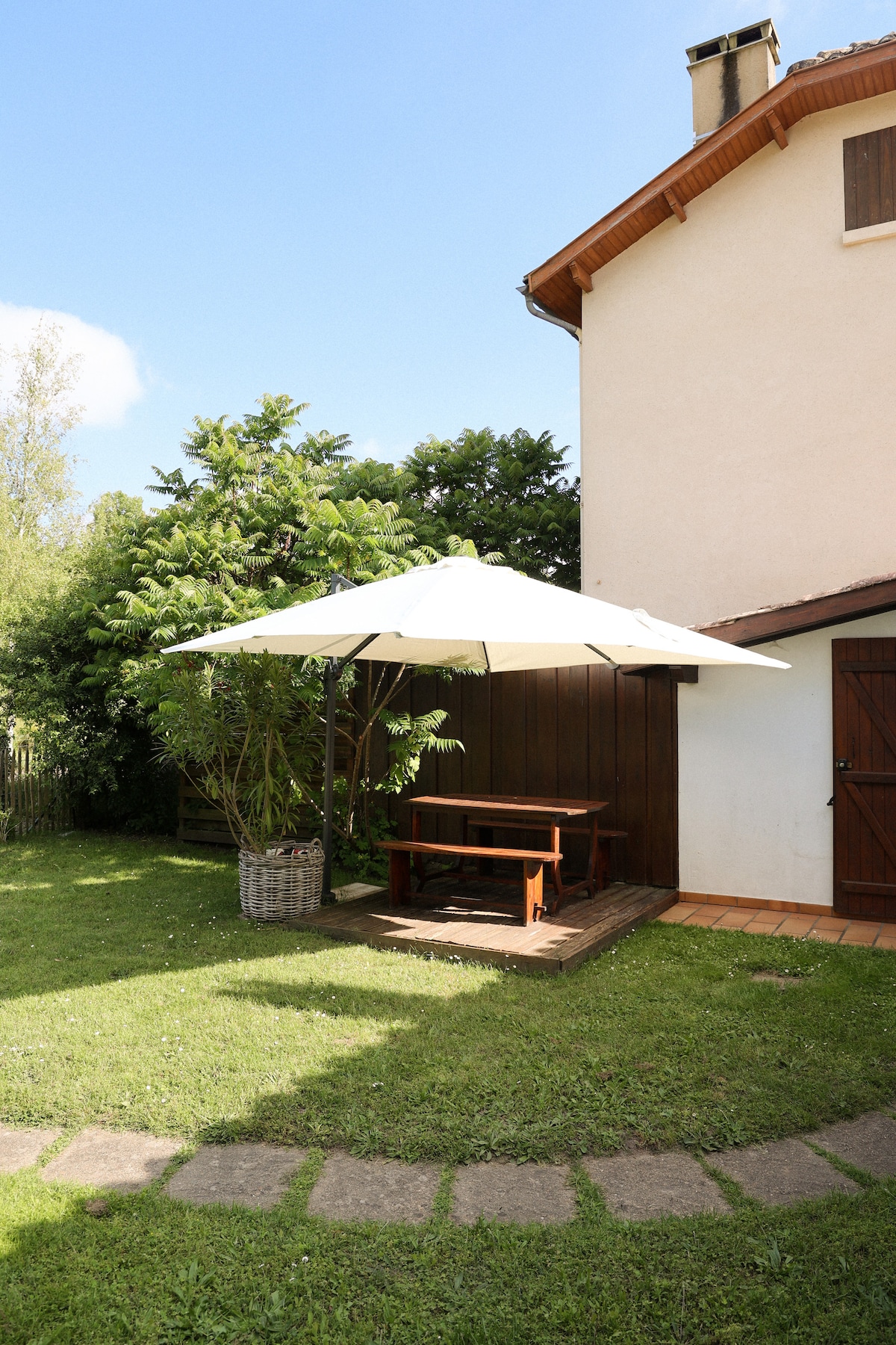 Beautiful house with pool & jacuzzi located north of Toulouse, with big deck made of exotic wood, dominating a private lake The house is surrounded with wide wooded garden (2000m2) A secured parking lot (100m2) is accessible for the guest The access is a private road, common with 3 other houses It is very quiet with no direct view on Neighbours Fabrice & Sophie will be happy to share their little paradise Optional (contact us) -Jacuzzi -Large extra suite -Weekend extension Arr. 2pm - Dep. 6pm