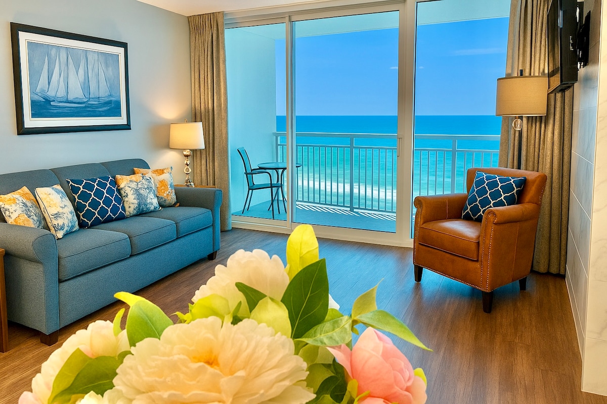 We are excited to say: the beaches, pools, and restaurants are now open! This condo is professionally cleaned!! Key Features of this condo include: * Oceanfront One Bedroom at Sandy Beach Resort * 1 King Bed, with Sofa Bed, Sleeps up to 4, sheets provided * Private Bathroom * Fully Equipped Kitchen, with Kitchen Table * High-speed FREE Wi-Fi * FREE Parking * Indoor and Outdoor Pools, Lazy Rivers and Hot Tubs * Short walk to 2nd Avenue Pier and Family Kingdom Amusement Park