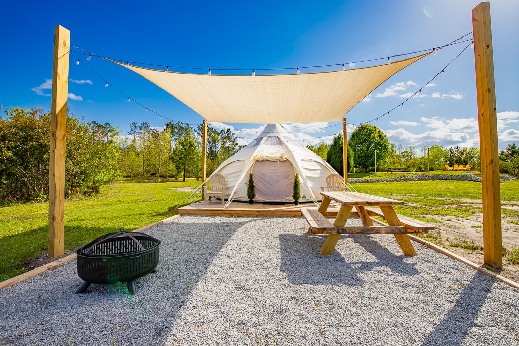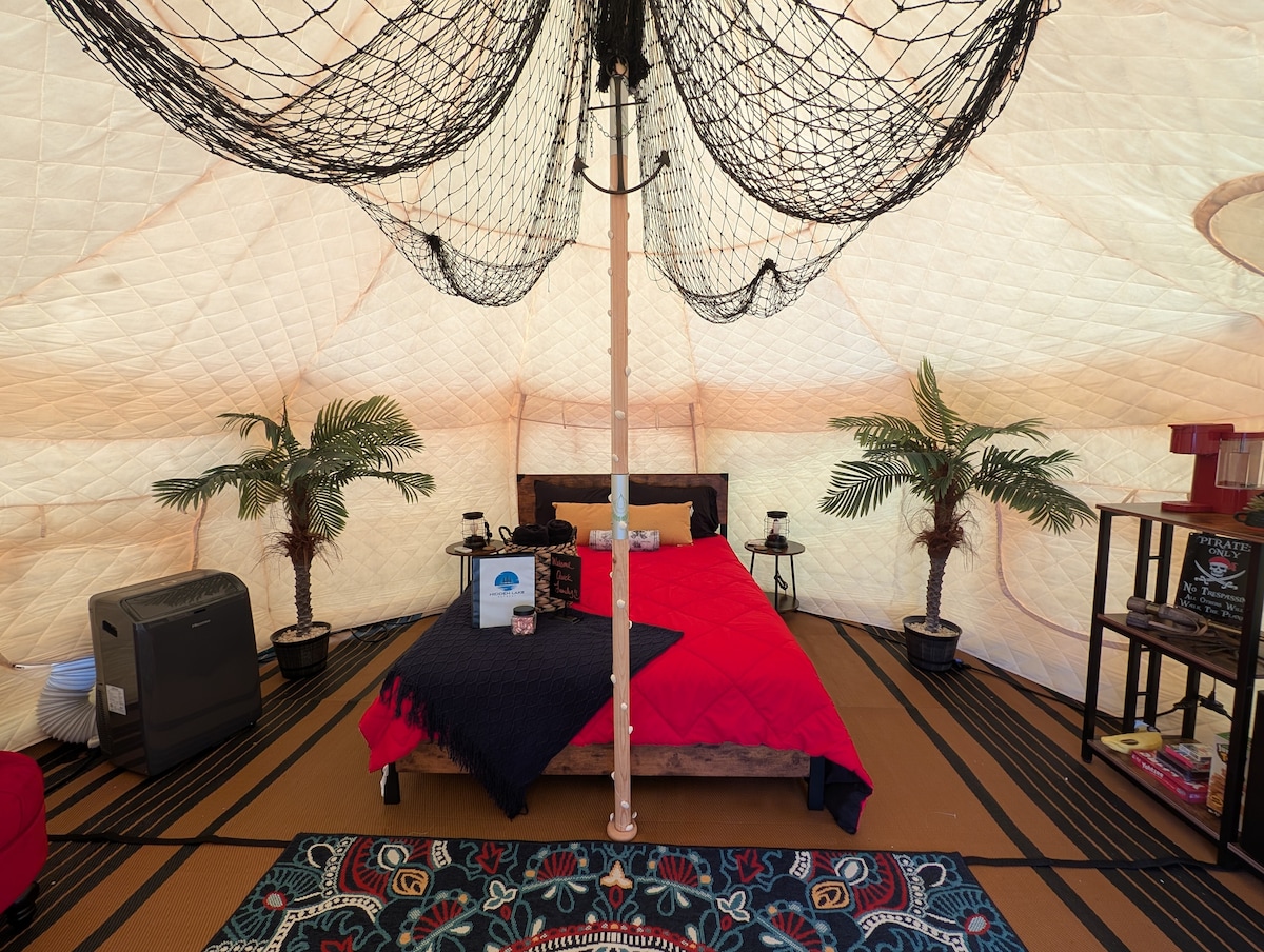 Reconnect with nature for lasting memories. Our luxury belle tents provide you with a truly unique accommodation experience under the stars! You can open the canopy at night, allowing you to enjoy a complete stargazing experience that is both breathtaking and serene. The Bella and The Oasis feature a luxury queen bed, air conditioning, heating, a mini fridge, a coffee maker, and convenient outlets for charging your phones. A true "glamping" experience!
