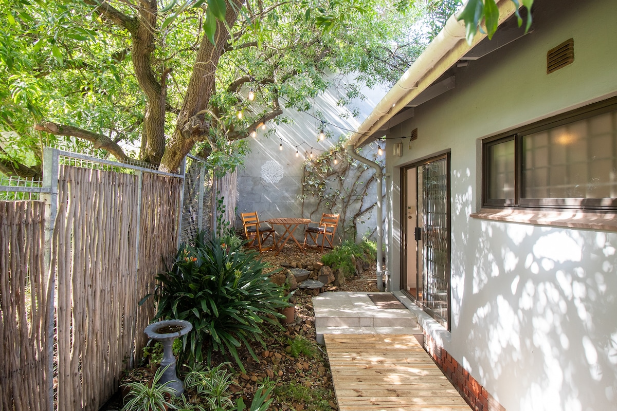 Pluck lemons from the tree and pick herbs from the planters for use in a tasty dish to enjoy in the cool and shaded courtyard. The bright and airy cottage interior has high vaulted ceilings, together with a selection of books and magazines to read to enjoy in the bed made up with 400TC luxury linen. Battery backed up Wi-Fi and additional lights for surviving load shedding. No smoking allowed on property. Guests have own cottage with a private, shady courtyard. Herbs in planters in courtyard and dart board are available for guests to use as well as lemons on own lemon tree. We're an international family consisting of a South African, a New Zealander and a Norwegian. One of us will always be available on our phones and we're happy to chat and share a G&T on our porch if our guests are up for it! This guesthouse is in a quiet neighbourhood, about 15 minutes by car from town and near to vibrant Harfield. Closer still, the village offers a farm stall, butchery, and supermarket within a short walk, plus coffee shops and lots of restaurants. We always recommend uber for short term stays in Cape Town but there is an off-street sheltered parking available if needs be. 10 minute walk to Kenilworth train station and 2 minute walk from Main Road with frequent taxi buses in both directions. Servicing of cottage and laundry can be done on request. Continental breakfast can be provided on request.