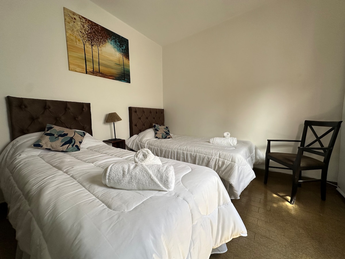 Disfruta de una estadía cómoda y práctica en este monoambiente para dos personas ubicado en el macrocentro de la ciudad de Salta. Situado en un edificio nuevo y moderno, cuenta con cerradura inteligente y acceso controlado, para que te sientas tranquilo y cómodo durante tu estadía. Este depeartamento tiene aire acondicionado, Tv de 43 y WIFI libre, cocina, nevera y horno. Tambien cuenta con toallas y ropa de cama.