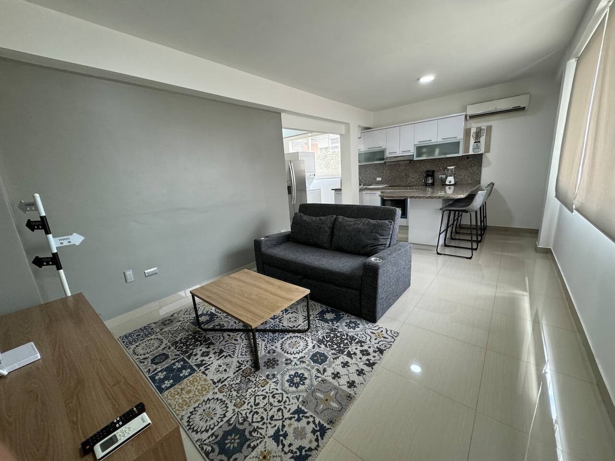 ¡Tu Refugio céntrico te espera! Nuestro apto, ubicado en el centro neurálgico, te coloca a pasos de comercios, restaurantes y transporte. Dormitorios Premium: Dos habitaciones con A/C. La principal con cama King y baño privado. La secundaria con cama doble e individual. Ambiente Moderno: Disfruta de una cocina concepto abierto, totalmente equipada. ¡Además, tienes lavadora y secadora para estancias largas! Confort Garantizado: Aire acondicionado y ventilación natural en todos los ambientes.