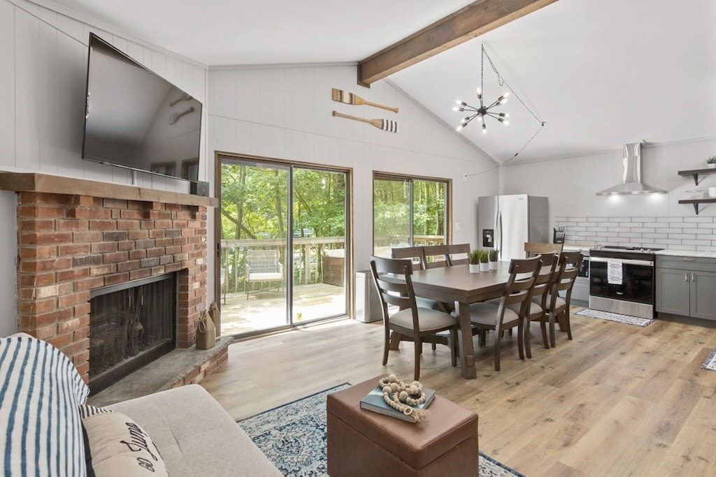 Escape the hustle of the big city in style at this picture-perfect open floor plan Modern Ranch Home, nestled in nature surrounded by 1.5 acres of breathtaking native white birch trees. The Ranch house offers a one-of-a-kind modern rustic aesthetic from the pro design team at Restoration Hardware. Full kitchen, king-size master bedroom, indoor fireplace, indoor & outdoor dining area, outdoor lounge, rustic chiminea-style firepit. There’s something for the whole family (including furry friends).