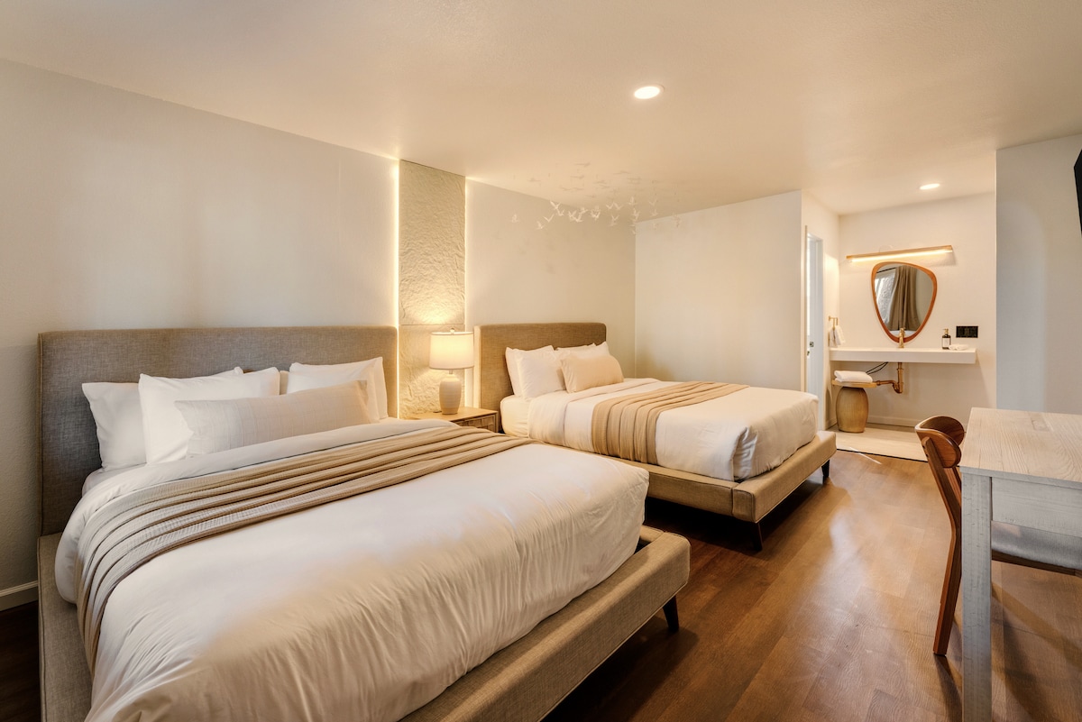 Step into this newly renovated room at Candlewick Inn and relax in a space designed for comfort and convenience. With two plush queen beds, modern décor, and access to a seasonal saltwater pool, this cozy retreat is ideal for friends, couples, or small families. Located near natural springs, local restaurants, and unique shops, such as Historic Downtown, Intrigue Theater, and Thorncrown Chapel, it’s the perfect base for exploring everything Eureka Springs has to offer.