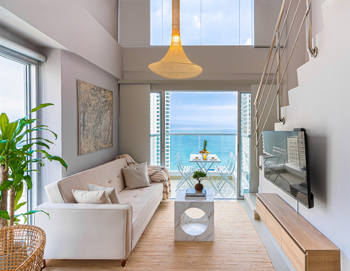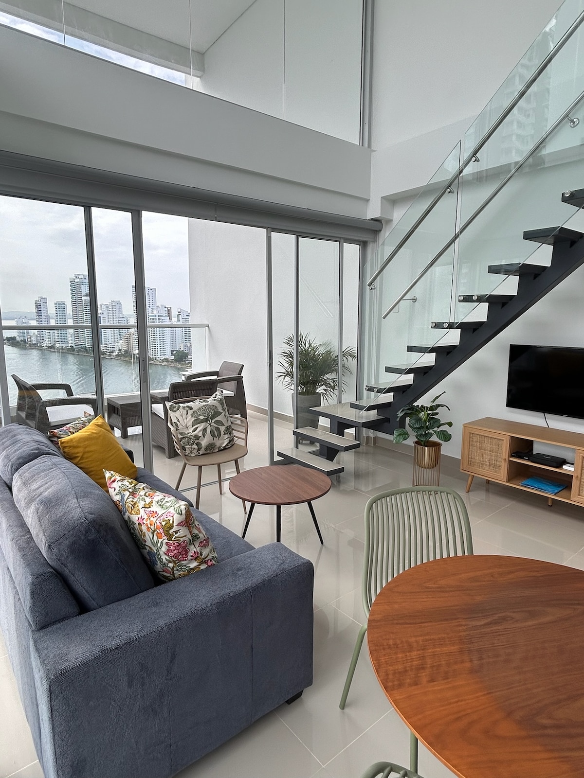 This apartment is perfect for couples looking for an exclusive place to stay, with everything within reach. It’s also suitable for older guests. The building is a residential tower located above a shopping center that has it all — supermarkets, restaurants, and stores. The apartment itself has an elegant style, thoughtfully designed down to the smallest detail. It's filled with Cartagena-inspired art and offers a spectacular view.