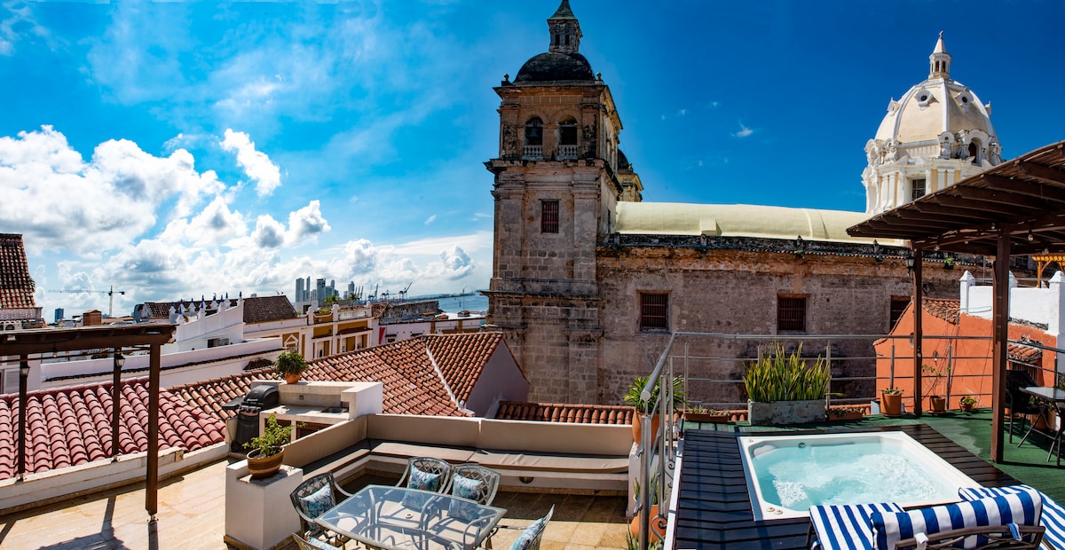 Centrally located inside the most prestigious area within the old city walls, this amazing 5 bedroom house is walking distance to ATMS, grocery stores, jewelry stores, and fashion shops. Located next to San Pedro Claver Plaza where trendy bars, dance clubs, and restaurants operate day and night. A luxurious home with AC throughout, hot water showers, fully equipped kitchen, roof top jacuzzi, consistent WiFi, TV with cable, taxis nearby, 15 minutes from airport, 5 minutes from beaches.