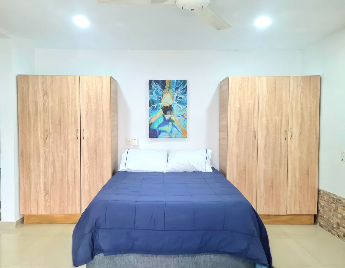 Apartaestudio ideal para una o dos personas con entrada totalmente independiente de la casa, muy cómodo y acogedor para estancias cortas o largas. Tiene todo lo necesario para que te sientas a gusto en tu estadía como una cocina y baño bien equipados, opciones para domicilios de comidas rápidas, desayunos o de productos para preparar tus propios alimentos. El lugar es muy central en caso de desear ir a algún sitio turístico o centro comercial. Ambiente agradable y familiar para disfrutar.