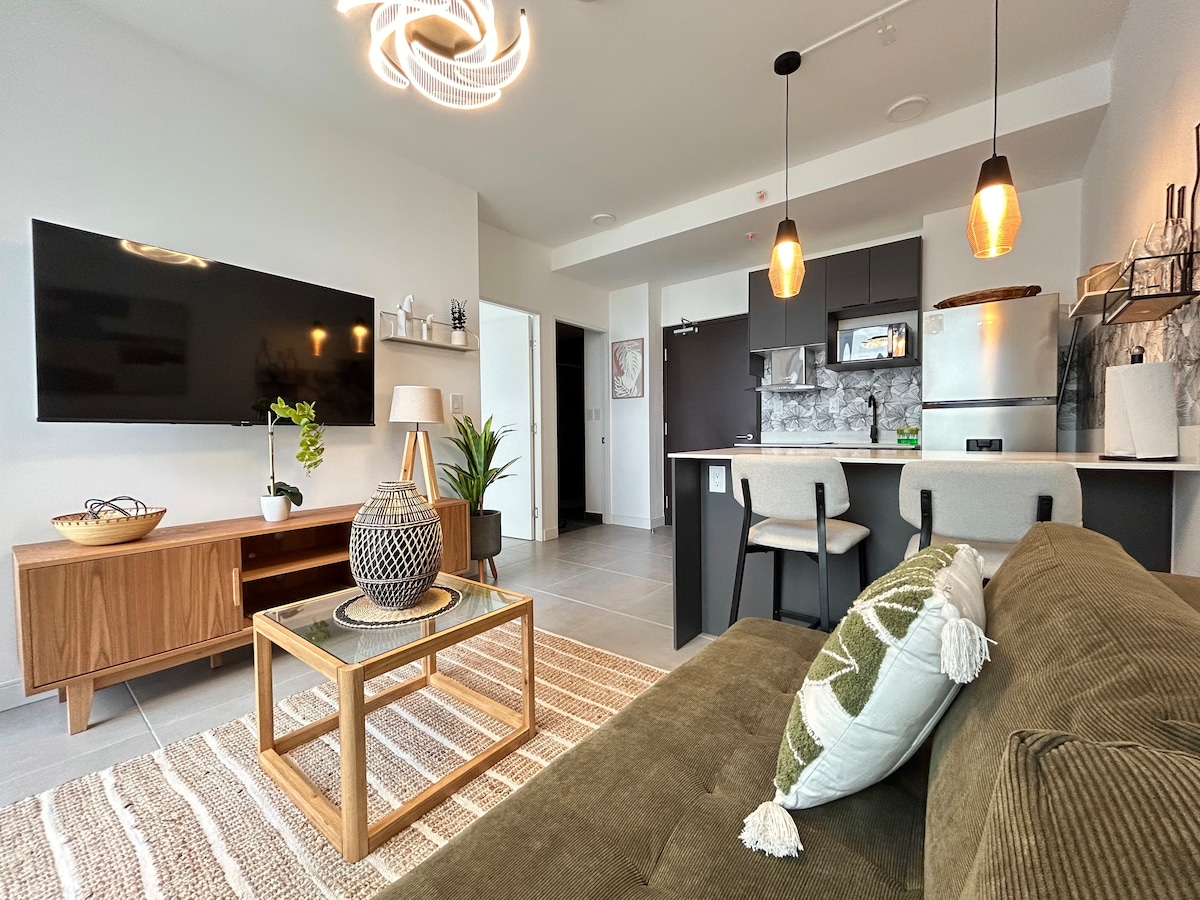 Welcome to our cozy apartment, perfect for your Airbnb stay! As you step inside, you'll be greeted by an open-concept living area that combines a cozy living room, a dining area, and a fully equipped kitchenette. A sofa and a table firepit perfect to unwind after a long day. The bedroom is furnished with a comfortable bed adorned with soft linens and fluffy pillows. Adjacent to the bedroom, you'll find a modern bathroom with a walk-in shower and all the necessary amenities. Book with us today