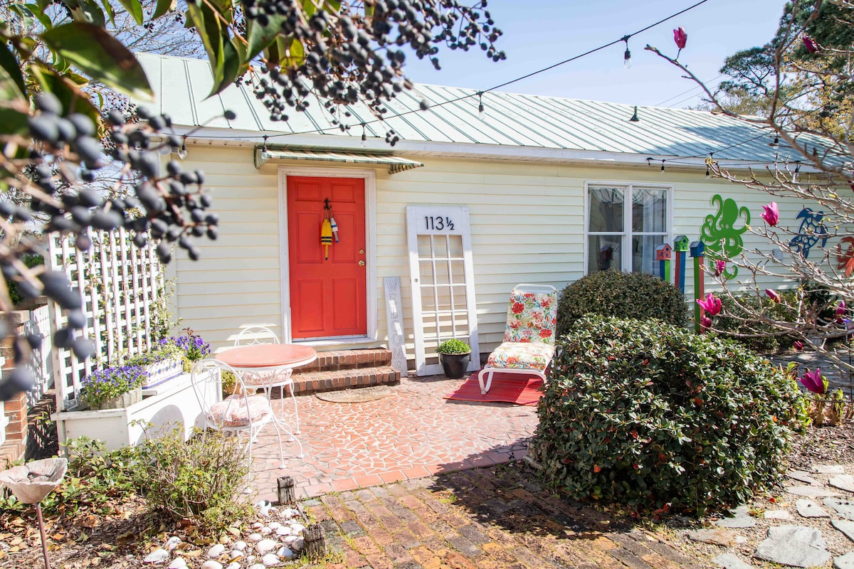 Unique guesthouse within walking distance of downtown historic Beaufort.We are one block from Taylors Creek. We provide kayaks and bikes for your pleasure. If an IPA fan we are a 5 minute walk to The Mill Whistle Brewery. The cottage has keyless entry and a choice of 2 ground level decks. Spacious living area and kitchen provide all the comforts you would need for your stay, just bring groceries. Basic spices provided.We provide linens, towels, laundry detergent, hair dryer, shower supplies