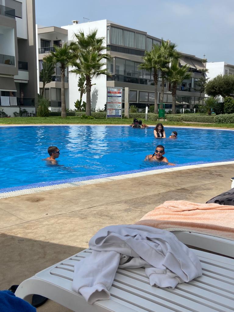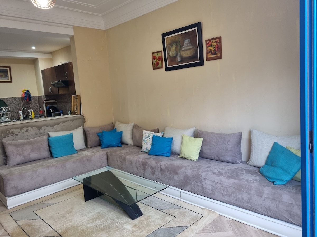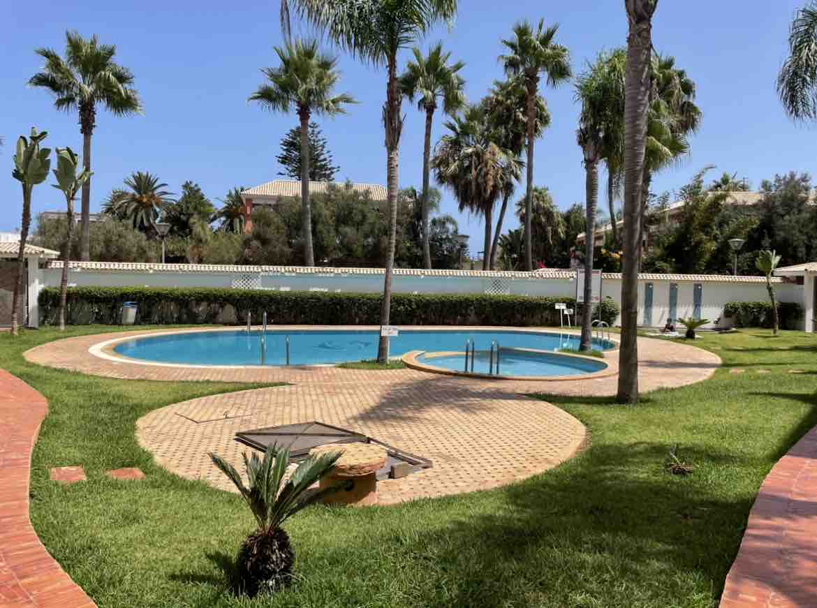 Bonjour, Je mets en location un appartement de 90m². L'appartement est situé dans la résidence Marbella Beach à Mansouria. L'appart est meublé,ensoleillé, propre avec 2 chambres en lits double+grand salon avec TV et salle à manger + cuisine équipée + 2 salles d'eau + deux balcons (vue sur mer et vue sur piscine). La résidence est sécurisée + Piscines + Air de jeu + Super marché. A 10 min en voiture des plages Mimoza, David et 25 min de Daomé, Bouznika Idéal pour une famille entre 5 et 7 pers.