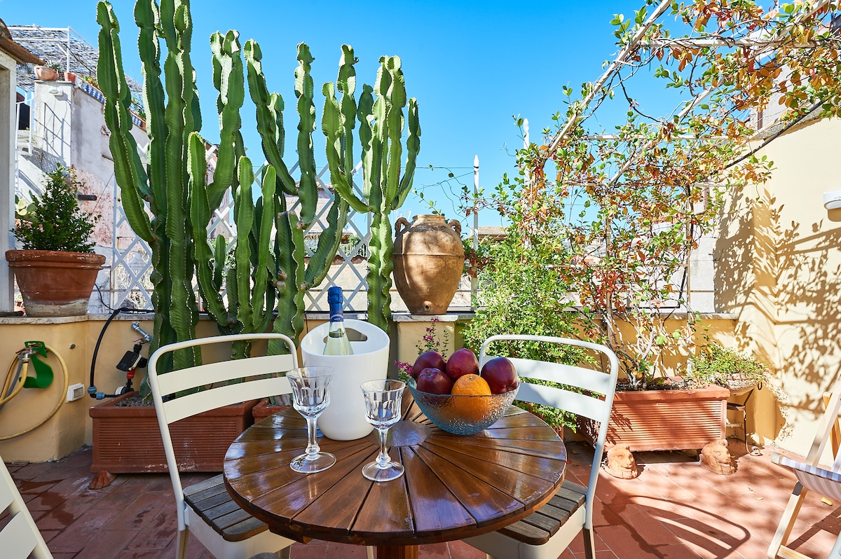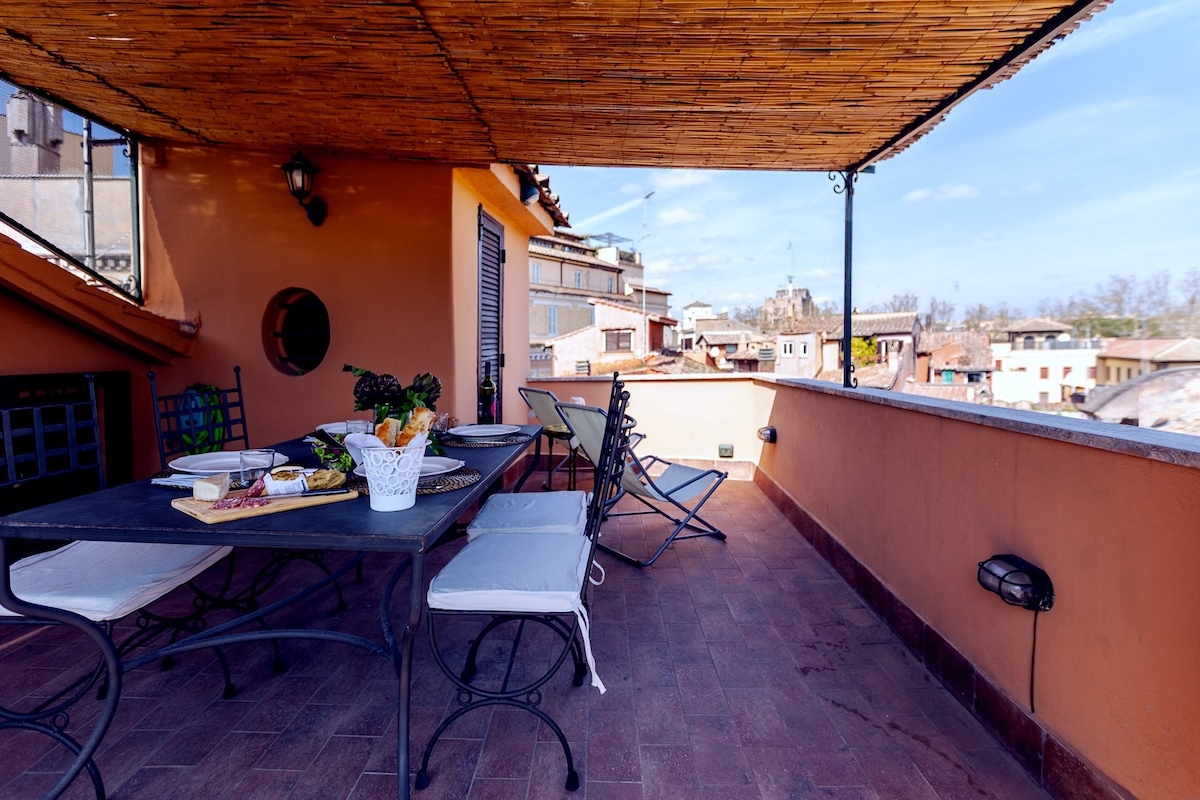 Bright and quiet penthouse apartment in the heart of Trastevere, with a wonderful terrace and an unparalleled view of charming roman roofs and the Gianicolo hill. The flat is meticulously refurbished and set in a picturesque cobblestoned street, just around the corner from the lively restaurants and cafes. La Casetta al Mattonato is located on the 3rd floor (41 steps, no elevator) of a 1600s typical roman building, within walking distance of all major attractions.