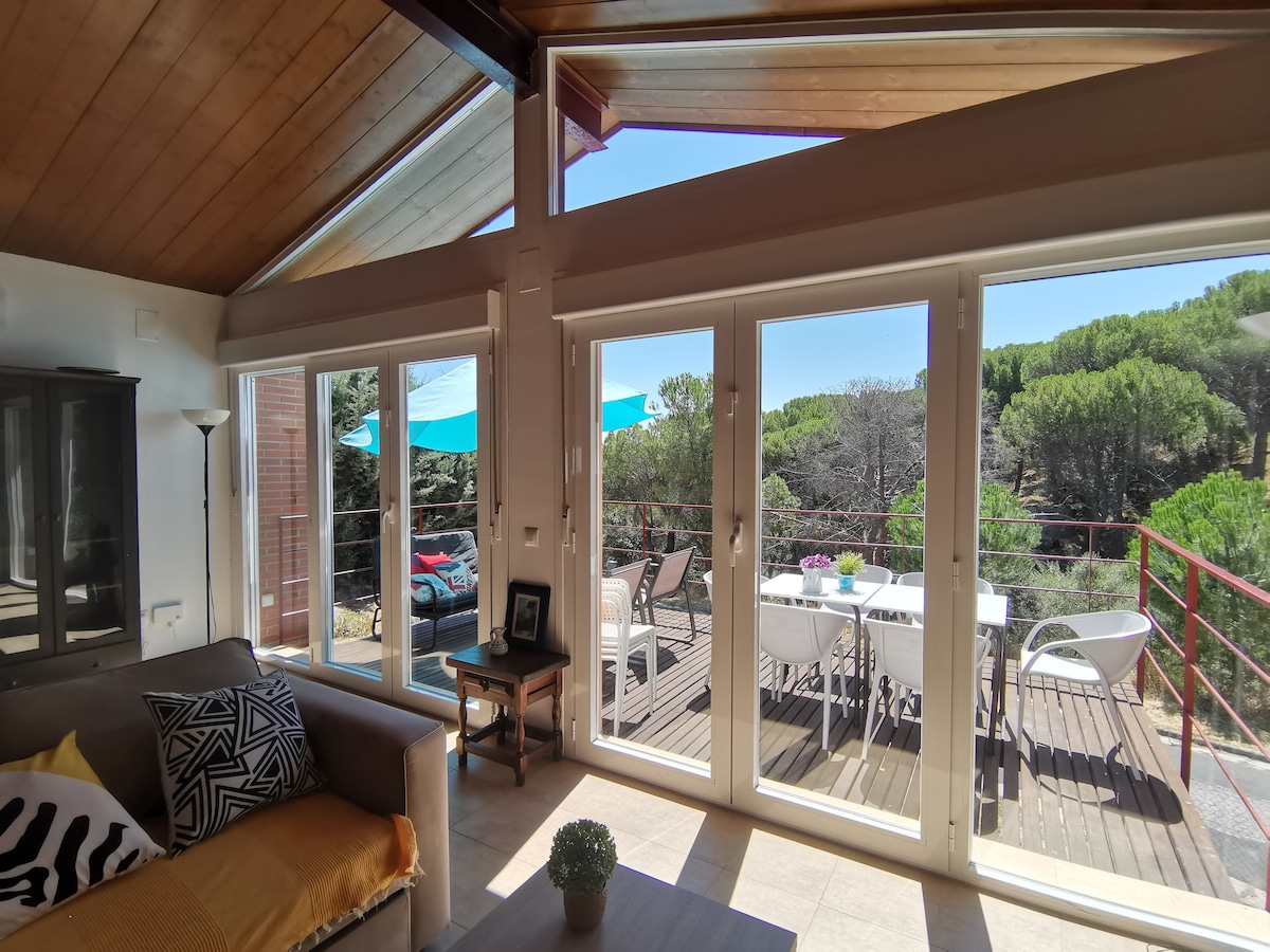 Take a break and unwind at this peaceful oasis. This special holiday home is located in the middle of the nature reserve of San Martin de Valdeiglesias above a large lake and is very suitable for water sports enthusiasts and hikers. From the bright living room and the private terrace you have a view over the trees, the lake and the mountains. Here you can completely relax while surrounded by nature and cool off in the swimming pool located in the back.