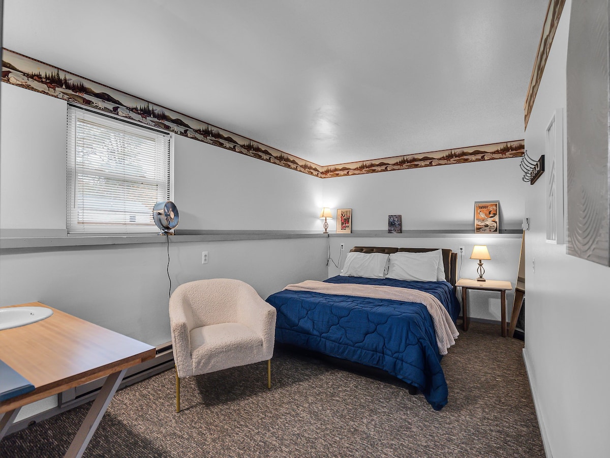 Whether you’re here for a ski weekend, or a reasonably priced stay during any season, our rooms are always clean and ready for your arrival. This room is located on the third level, includes a mini-fridge beneath your 43 inch Smart TV with Netflix configured, and free high-speed WIFI. Fresh linens will be found on our comfortable beds. This room contains a queen bed and full size bunk beds. Your en-suite full-sized bathroom is stocked with bathroom amenities and additional towels.