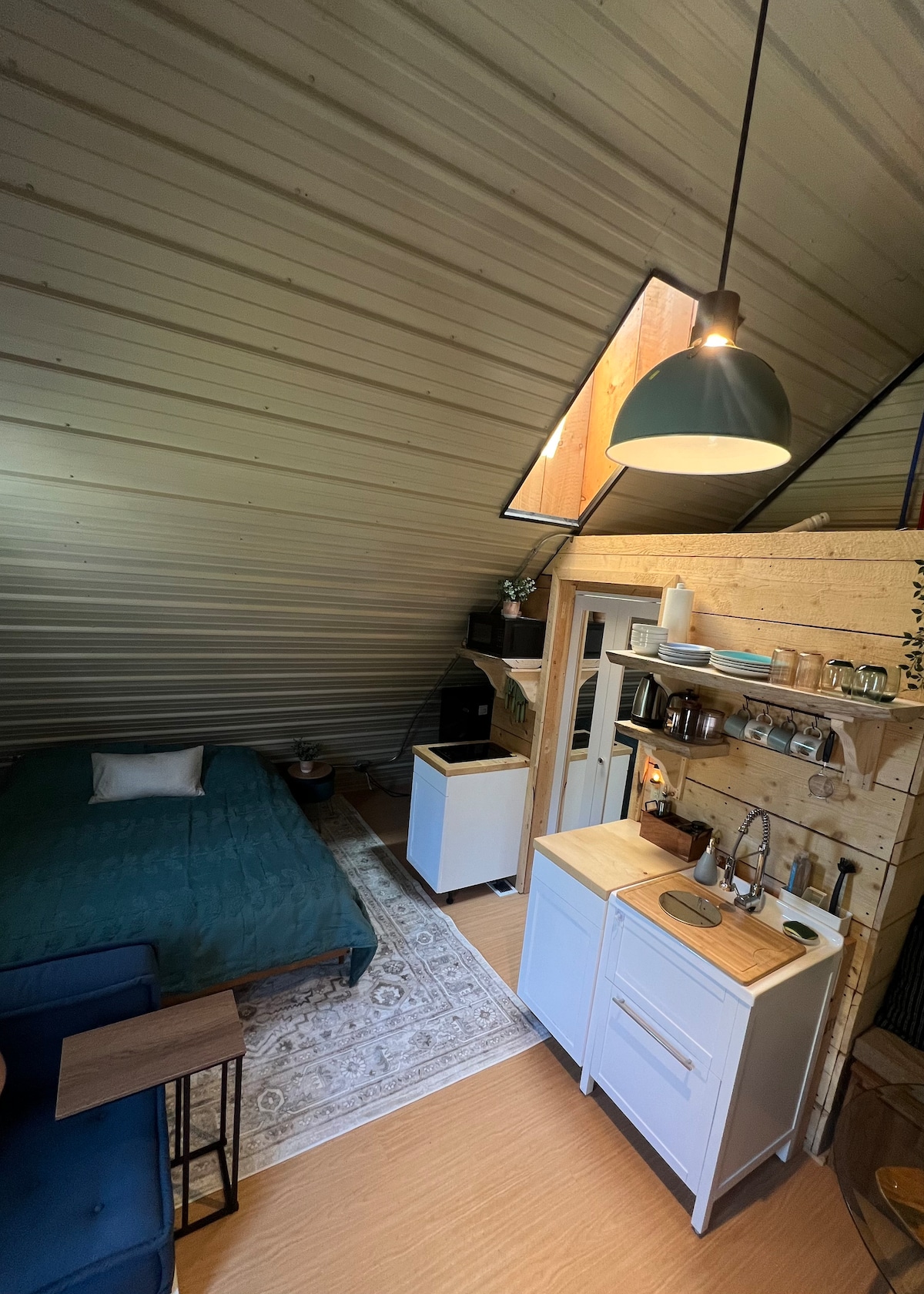Tiny home A-frame offers a cozy escape with a rustic vibe and thoughtful décor. Inside, you will find a queen-size memory foam bed with linens to ensure comfort. The unique side of the A-frame opens to a spacious porch, perfect for morning coffee or unwinding in nature. Stay comfortable with A/C and extra blankets. This unit is just steps from the bathhouse with hot showers and a communal kitchen. This unit is pet friendly.