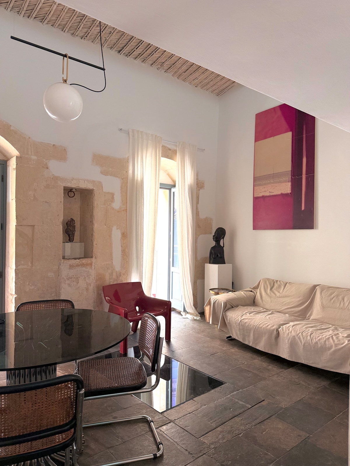 Rilassati in questo elegante e moderno open space di 80 m² situato in un tranquillo cortile accessibile da una breve scalinata che sale da corso Vittorio Emanuele, la strada barocca più animata del centro di Noto. Avrai a tua disposizione una cucina completamente attrezzata, un bagno accogliente, una lavanderia, biancheria selezionata, smart tv e wi-fi. La camera soppalcata è dotata di un letto matrimoniale con topper in piuma e una selezione di cuscini, per garantirti il massimo comfort.