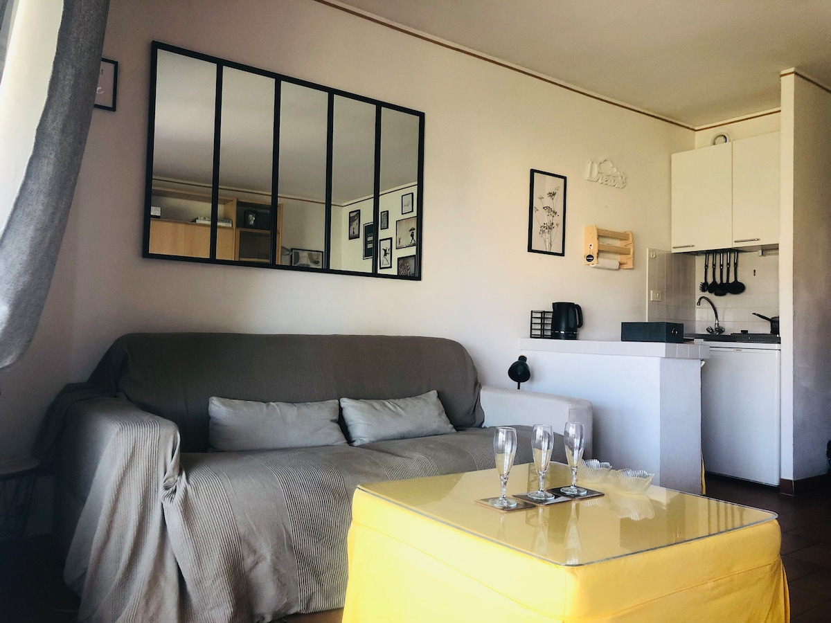 Proche de la mer et des plages Résidence le hameau du soleil à Cavalaire sur mer. Environnement très calme, appartement 2 pièces, climatisé , c cuisine entièrement équipée. 1er étage , résidence de qualité sécurisée avec piscine ouverte du 15 Mai au 15 Octobre Salle de bain douche 75x75. Parking fermé. Restaurant pizzeria à 5 min à pied, nombreuses animations en période estivale.. Une chambre plus 2 lits "cabine" superposés Idéal pour 4 personnes, navette gratuite pour se rendre à la plage.