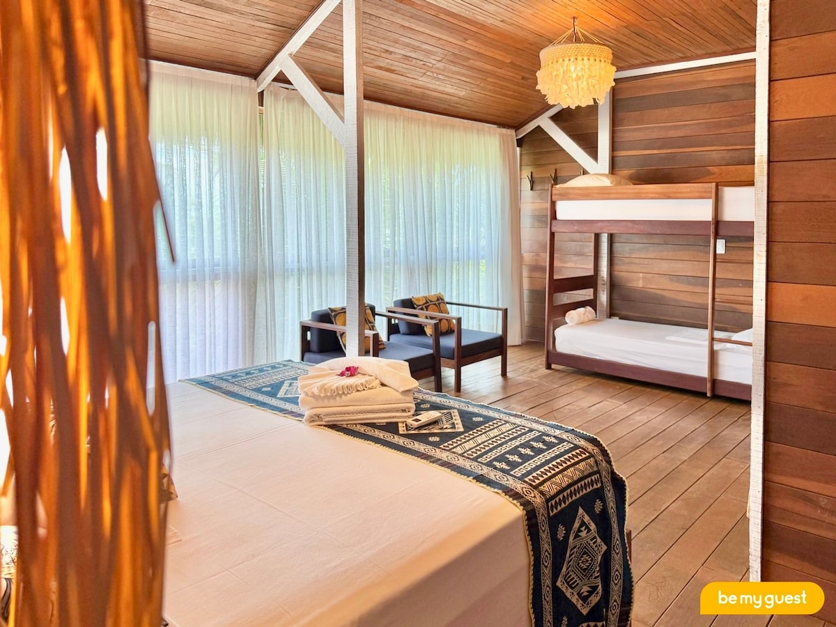 O chalé do Primeiro Andar é perfeito para casais e acomoda até 4 pessoas. Desfrute de uma vista incrível da praia de Redonda. Ambiente climatizado, cozinha completa, e para completar, uma churrasqueira à disposição. Relaxe neste lugar único e tranquilo com uma vista esplêndida da orla.