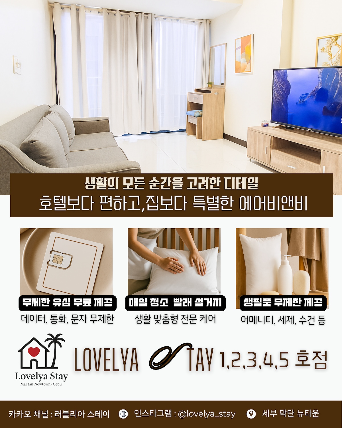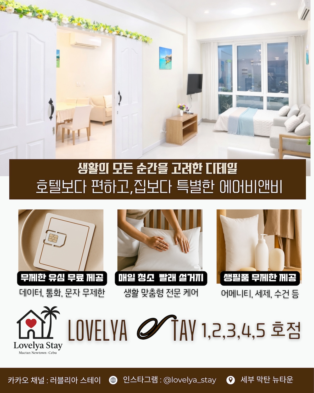 러블리아 스테이는 같은 컨디션, 같은 서비스를 제공하는 1, 2, 3, 4&5(커넥팅룸)호점이 있습니다. 호스트의 다른 숙소 확인을 통해 상세 정보를 확인 하실 수 있습니다 :) ㅋㅏㅋㅏ오 채널 : 러블리아스테이 - 할인 사랑이 머무는 곳, Lovelya Stay No.1 🤍 🤍 탁 트인 씨뷰와 함께 시작되는 하루. 🤍 생활의 모든 순간을 고려한 디테일. 🤍 ‘호텔보다 편안하고, 집보다 특별한’ 휴식처. 🤍 막탄에서 가장 쾌적한 뉴타운에서, 깔끔하게 정돈된 세부를 만나보세요 - 오래 머물고 싶은 공간 Lovelya Stay. 당신의 세부 여행에서 가장 편안했던 공간으로 기억되길 바랍니다. - 💕 세부 라푸라푸시 막탄 뉴타운(Mactan Newtown, Lapu-Lapu City, Cebu) ➖➖➖➖➖➖➖➖➖➖➖➖➖➖➖