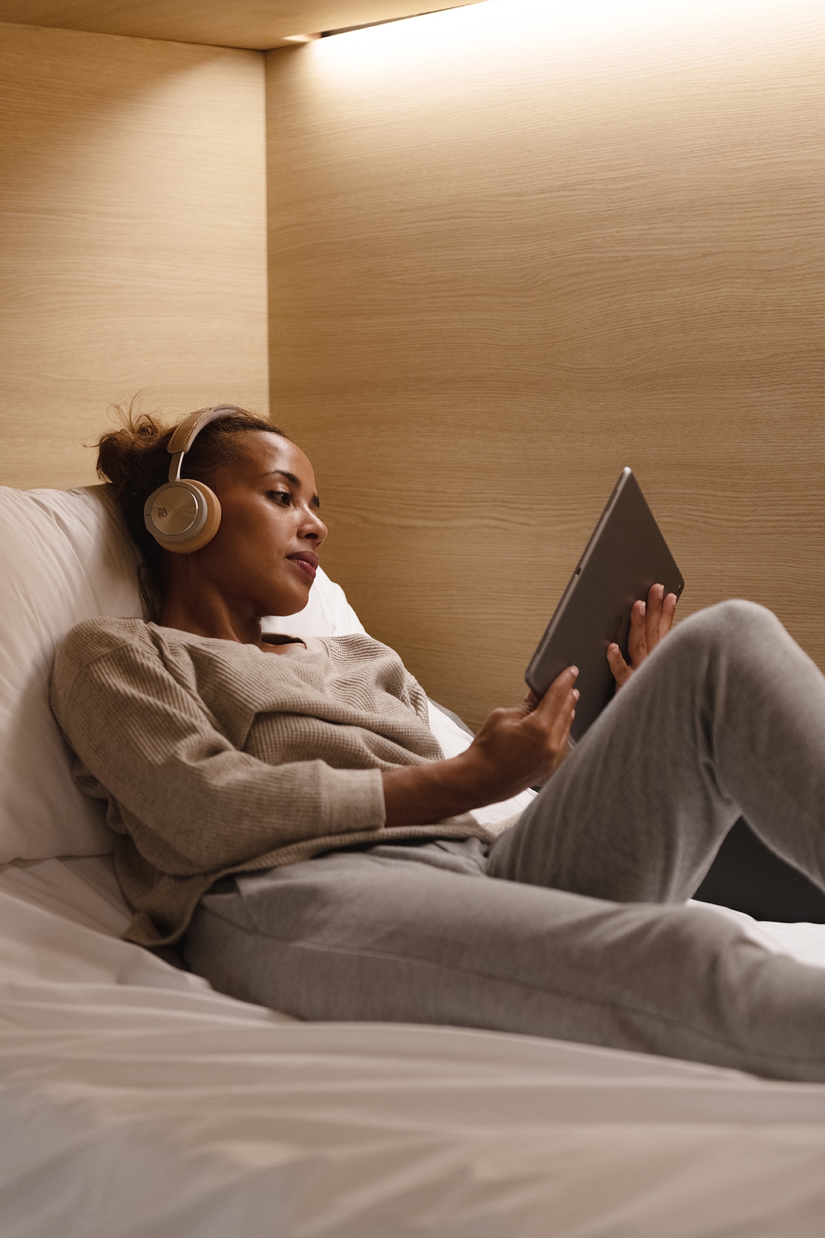 This 4 SQM modern – cool Pod is equipped with everything you need for the perfect stay for two guests. Room features: A King size bed with Egyptian cotton linens, a working desk, safe, sink, towels robes and slippers for your comfort. While you can easily control all the features in the room from the Wom's App, you may also check the vacancy of your shared private bathroom, outside your room.