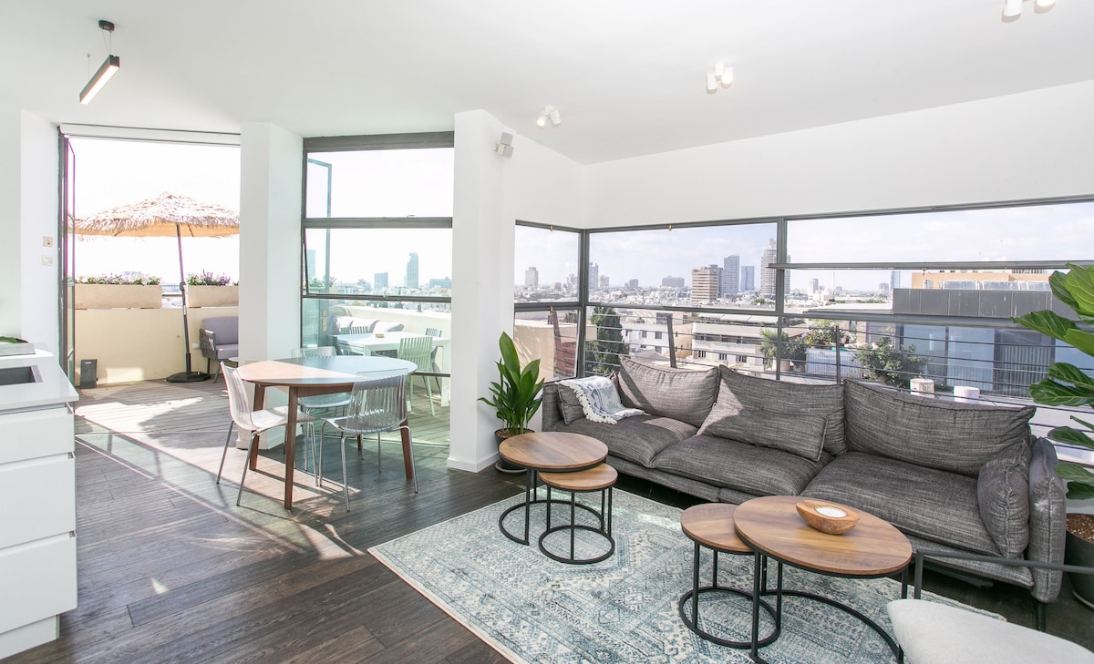 Indulge in the elegance of this exquisite apartment. The stately home features a vast open-plan living area, an all-white monochrome interior contrasted by wood finishes, a minimalist aesthetic, a private sauna, private jacuzzi and a wraparound patio with a BBQ. Our apartment is one minute walking distance from Dizinghof Square, and 6 minutes walking to the beach. The place is highly equipped and relatively new. Our apartment is one minute walking from Dizinghof square and six minutes walking from the beach . Restaurants , and coffee shops are all around.. It takes about 25-30 minutes to walk to both the Port ofTel Aviv or Jaffa (opposite direction)