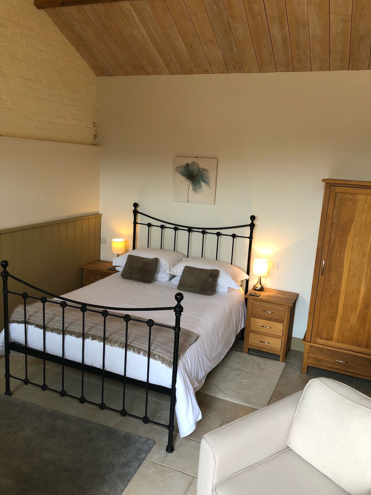 Not suitable for children. The Wing is in a peaceful location with underfloor heating, king size bed with cotton bedding and walk in shower. Snacks, wine and light breakfast foods are a gesture. . There are no cooking facilities has kettle and toaster Courtyard garden. Set in a beautiful countryside location with gorgeous walks to a gastro pub and high end hotel. Close access to London both by train and car and near to local market towns Hitchin Letchworth and Stevenage. Parking under carport