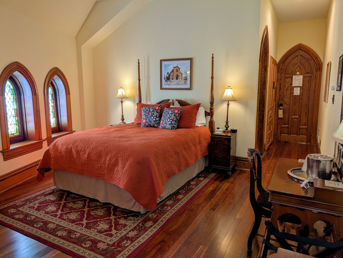 Discover refined elegance in The Riverfront Suite, where Gothic grandeur meets contemporary comfort. This distinctive retreat showcases original stained glass windows and exotic wood finishes . A plush queen bed and ambient electric fireplace create an intimate atmosphere, while the luxurious en-suite bathroom features heated floors, designer tile work, and a 2-person soaking tub. Take in panoramic city views from the shared rooftop hot tub. Perfect for couples seeking a romantic escape.