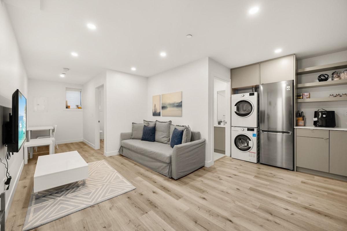 Centrally located, renovated, private suite on the main floor of a beautiful house, steps away from Main St. amenities & easy access to downtown. Enjoy a one-bedroom, & sofa bed, SS appliances in a fully equipped kitchen, & the warmth of gas fireplace, portable A/C & air purifier. Hardwood floors extend to two decks, one covered by a landscaped backyard. Within in-suite laundry, this place promises a memorable stay amidst city life. Free street parking. No pets, not suitable for young children.