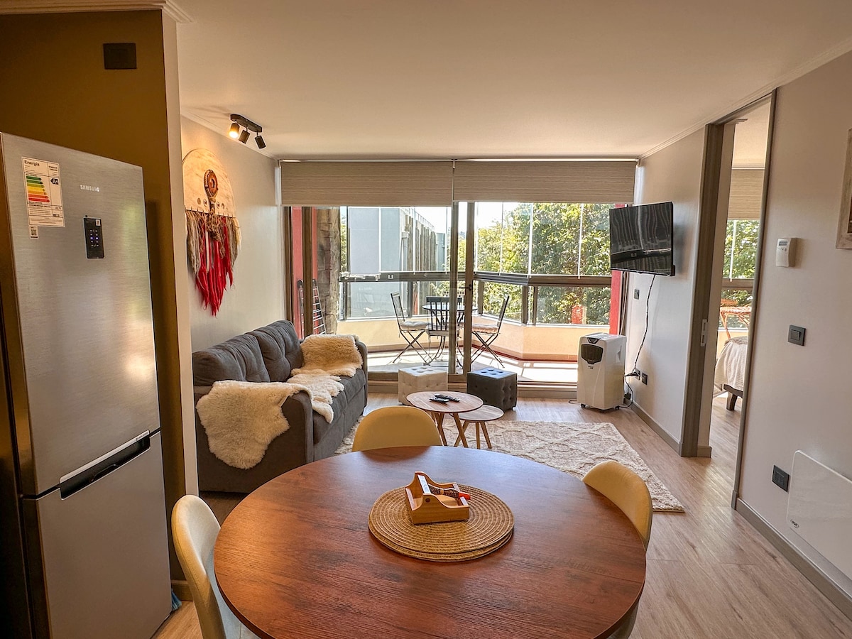 Nuevo y acogedor estudio en la mejor ubicación de Pucón, a pasos de playa grande, centro, y aislado del ruido de la calle principal. Cuenta con cama de 2 plazas, un futón de 2 plazas, cocina full equipada, baño completo, WiFi, TV 49" con Netflix, Disney+ y más, terraza, calefacción, parrilla, cafeteras, 2 bicicletas de uso ilimitado, entre otros. Estacionamiento público frente al acceso al edificio disponible. Incluye ropa de cama, toallas, e insumos básicos de baño y cocina para cada estadía.