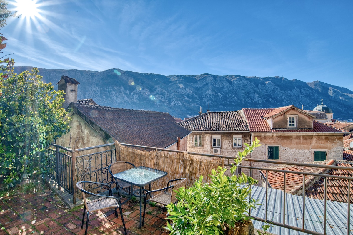 Right in the middle of world heritage of Kotor Old Town, climb 54 steps to this amazing studio with private garden and terrace featuring stunning views onto the rooftops, surrounding mountains and the sea. All walls are exposed stone or rock lovingly restored. The kitchen is well appointed and the decor is modern, light and comfortable. Old meets new.
