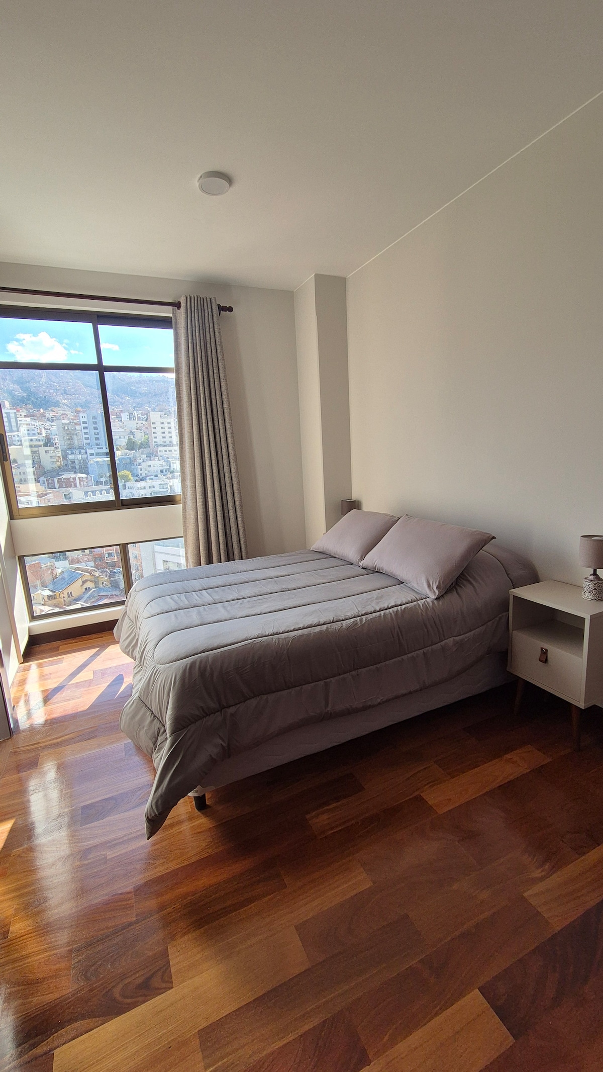 Ubicado en la mejor zona de la ciudad, a metros de supermercados, rodeado de restaurantes, cafes, entretenimiento, parques, pubs, bancos y más. Desde la puerta se encuentra transporte público a cualquier zona de La Paz. Equipado con todo los que necesitarás para sentirte en casa. Al estar en un piso 18 tendrás una estadía tranquila. El edificio esta siendo vigilado las 24 horas por lo que es 100% seguro.