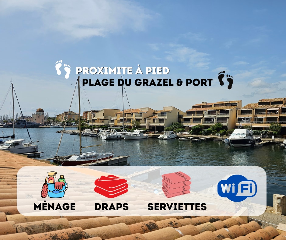 Détendez vous dans cet appartement calme et cosy entre amis ou en famille pouvant accueillir jusqu'à 6 personnes. L'appartement se situe à 40m de la plage du Grazel avec une petite vue mer et un accès direct à la plage par le portail de la résidence. Idéalement situé proche de la plage, du port, commerces, activités, restaurants et à 5min de la Balnéo et Pirate Parc Tout est accessible à pied ou en vélo. Résidence calme et sécurisée avec place de parking Wifi Chien accepté