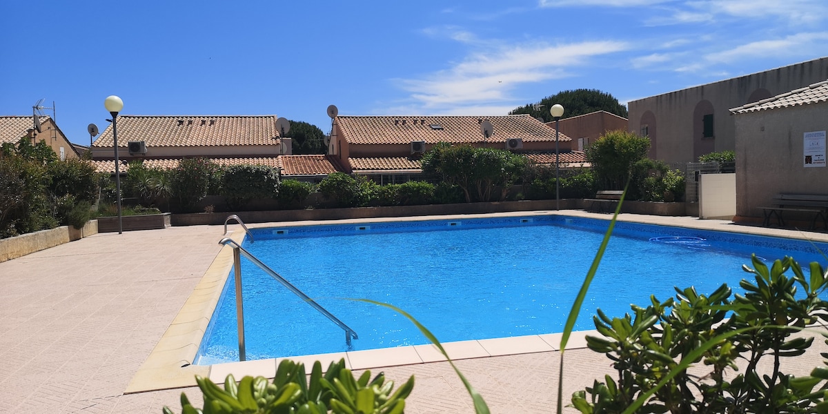 Agréable studio avec loggia, jardin et place de parking privative dans un environnement calme. Situé au bord du chenal qui relie le port au vieux village en passant par les étangs de Gruissan, il est proche de toutes les commodités (restaurants, commerces, marché, plage...), le tout accessible à pied et/ou à vélo. L'appartement dispose d' 1 cuisine, 1 pièce de vie avec son lit escamotable 2 places 140*190 , 2 lits superposés une place 80*190 , 1 salle de douche avec lave-linge, 1 wc séparé.