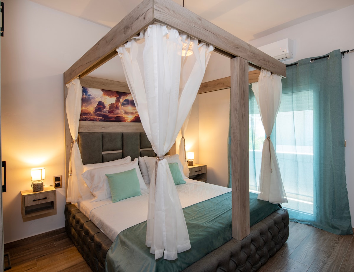 The KORES boutique houses are an independent, self-catering lodging of two furnished residences that have been specially developed in a completely renovated multi-storey medieval building, in the traditional district of Topanas, on the western side of the old Venetian harbor of Chania.Both residences are enchanting houses with hospitable rooms in light and frugal lines. The harmony of spaces in levels, the arches, erratic walls, the galleries and Venetian walls that constitute a part of the house, create an astonishing cluster of medieval architecture in the two residences with the names "Aspasia" and "Ekaterini". "Aspasia" occupies the ground floor and the first floor of the lodging and consists of: The ground floor with a double bedded bedroom and another with a couch – bed, and a bathroom with open shower. The first floor with the living room, the dining room and open-plan kitchen, two bathrooms with closed showers, a master bedroom in the loft and a bedroom with two single beds below. "Ekaterini" occupies the second and third floor of the lodging and consists of: The second floor with the living room, dining room and open plan kitchen, a bedroom with two single beds, a den with the “Turkish” couch that can easily host a 5th individual in the residence if necessary and a bathroom with a closed shower. The rooms of the second floor have access to a garden with a dining table, six chairs and an umbrella offering ample shade. The third floor with a master bedroom and its private terrace with a couch, a patio table and sun beds give the opportunity to guests to enjoy relaxation in the sun and the unhindered views of traditional backstreets, roofs and lofts of buildings, and of the mountains in the south.