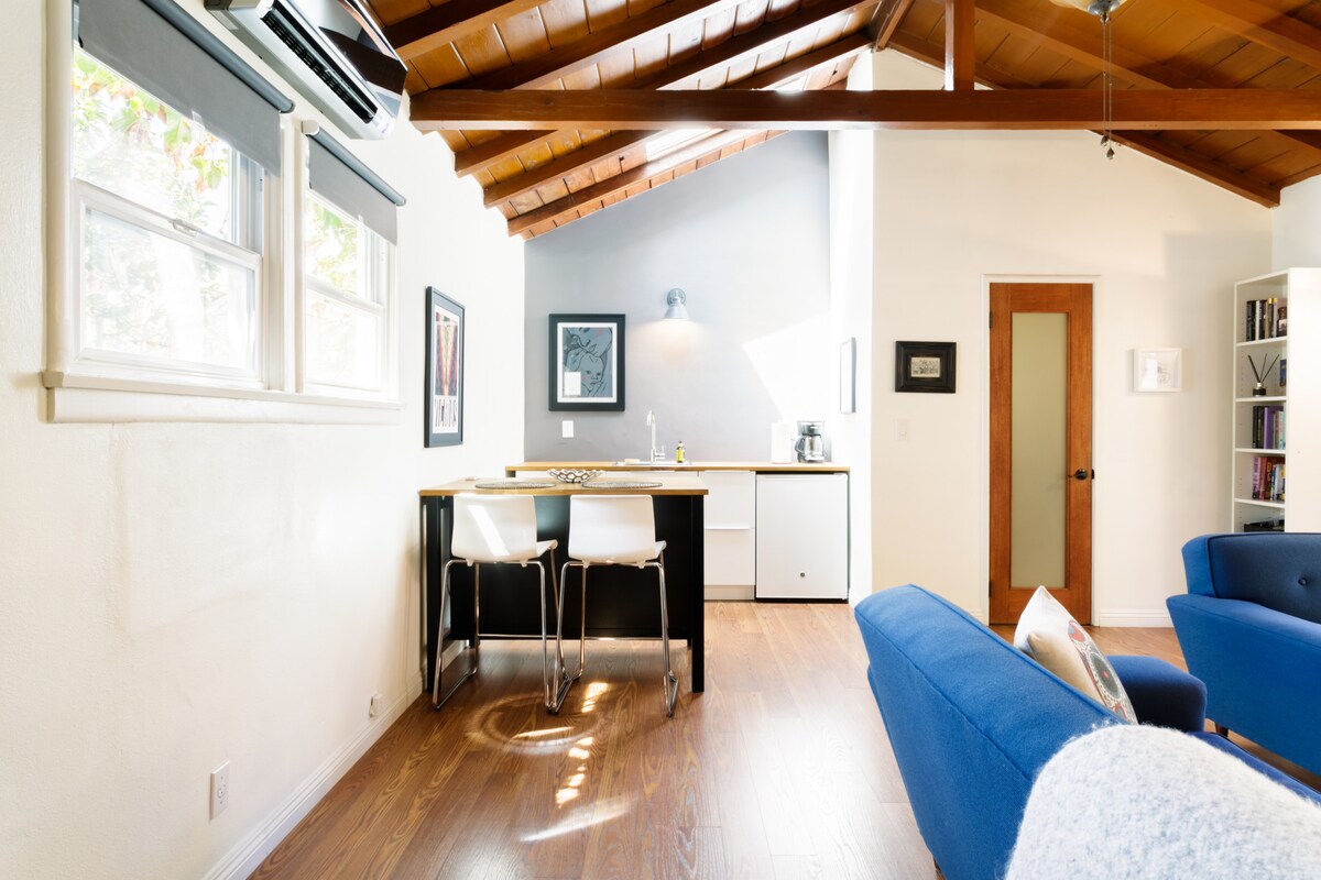 Gear up for the day with a morning beverage on the treehouse terrace, then relax in the soaking tub, or take a break under vaulted ceilings of the airy living room after a day of LA sightseeing. Contemporary artwork and a bold bedroom mural contrast with a sleek kitchen and crisp, white walls. This is a very special space; large, bright, modern and very private. A free-standing building nestled behind our Spanish revival home in a quiet Burbank neighborhood. Vaulted ceiling with skylight. Brand new bathroom with rain-shower and soaker tub. Large living room and kitchenette space and a huge bedroom with plenty of storage. There is dedicated wi-fi and a comfortable office area. The house is filled with artwork from LA artists, to bring a little of the LA streets to the comforts of Burbank. Guests will have access to dedicated Internet Wi-fi, Roku TV, Netfix, Amazon and HBO, outdoor dining area BBQ. A washer and dryer are available if needed. The guesthouse is a separate free-standing building located behind the main house with a private, keyless entrance. We live in the main house. We look forward to meeting you! We live in the main house only steps away and will be available if anything should arise. Experience the best of both worlds, with a quiet small town feel in the heart of a large metropolis. LA's vibrant attractions are nearby, but this quaint neighborhood is also home to charming shops and restaurants. - Bus stop less than one block away. - North Hollywood Metro station 3 miles away. - Universal Studios is 15 minutes from our house by car. - Plenty of FREE STREET PARKING. - Less than ten minutes from Burbank Airport. - Five minutes from Metrolink/Amtrack station. - Walking distance to downtown Burbank and Magnolia Park community. Our guesthouse is perfect for industry people needing to be close to the frenetic energy of Hollywood, but who still like the peace and quiet of a private retreat. For those looking to explore Los Angeles, we are close to the studios, shopping, Griffith Park, public transit and all major thoroughfares. There is one queen sized bed with a memory foam topper. An additional single bed can be added to the room if needed. The guesthouse has a separate kitchen area, however it is not a full kitchen. There is no stove or range. There is a microwave, kettle, toaster and fridge/freezer. At this time we do not accept long term guests.