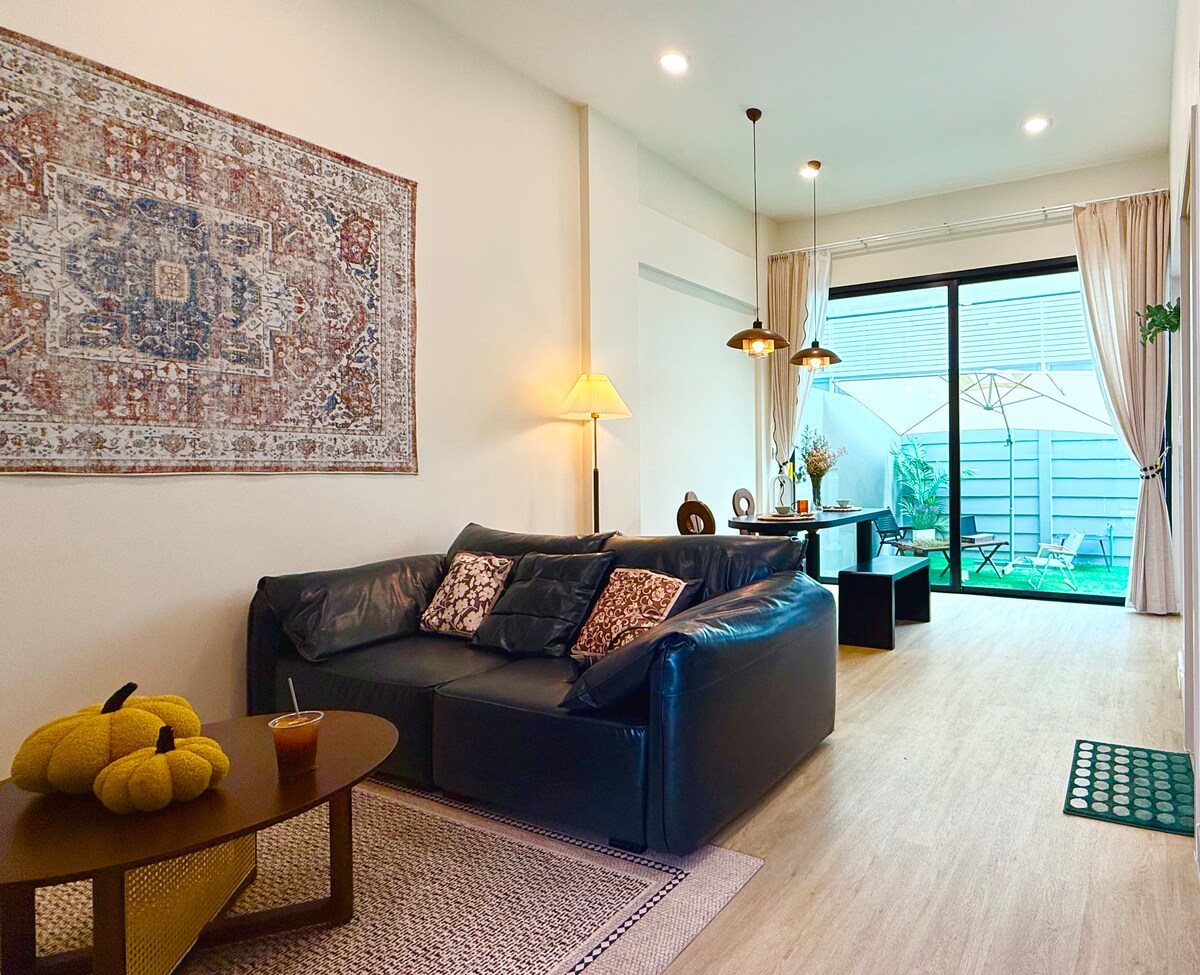 A spacious detached home in a private residential village, offering a peaceful and exclusive atmosphere. Fully furnished with modern appliances and a well-equipped kitchen for home cooking. Features both indoor-outdoor dining areas. Land size: 240 sqm (60 sq.wah) Usable area: approximately 200 sqm Conveniently located about 14 km from Don Mueang International Airport and 14 km from Chatuchak Weekend Market, with an estimated travel time of around 25 minutes, depending on traffic conditions.