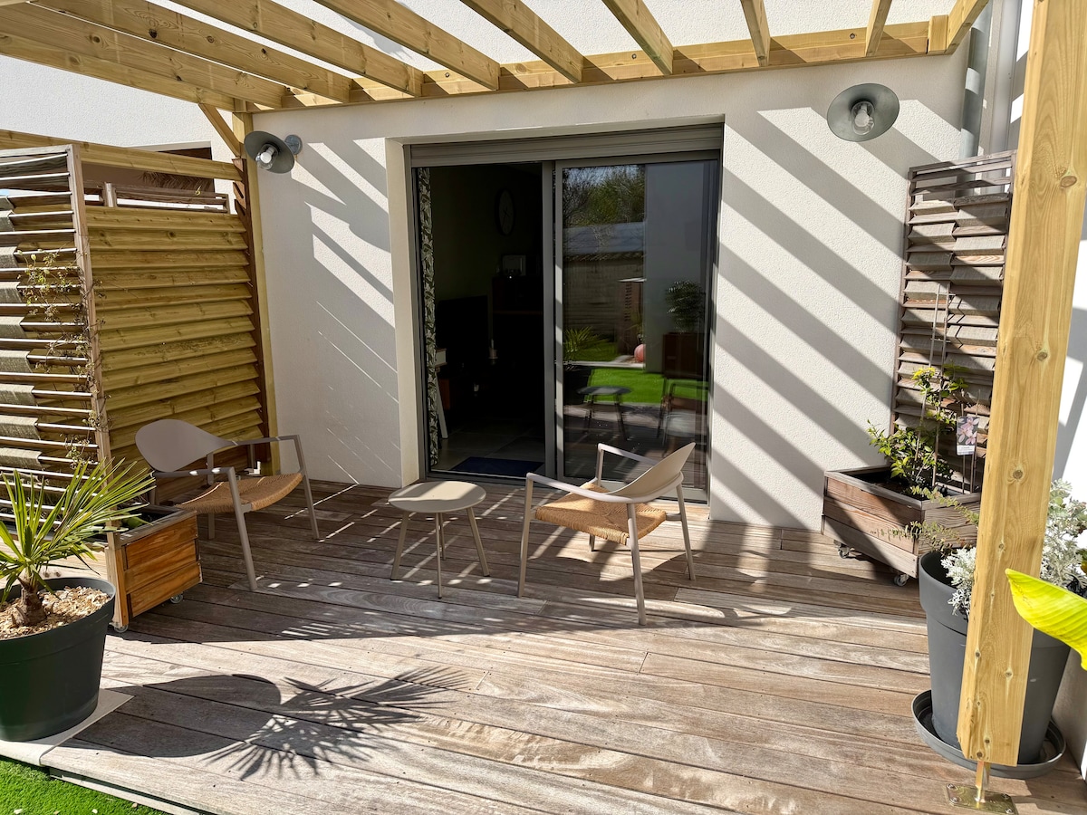 Agréable Studio/micro maison de 32 m2 refait à neuf au calme, avec petite terrasse privative plein sud sans vis à vis et plancha. Grande piscine et son pool house. Cuisine équipée, canapé Lit-gigogne, Lit de 140x200 dans l’espace Chambre en mezzanine (hauteur d’homme) accessible par un escalier en colimaçon. Literies de qualité. Internet haut débit/Fibre et câble Ethernet Secteur très calme. Parking gratuit A 10 minutes du centre ville de La Rochelle.