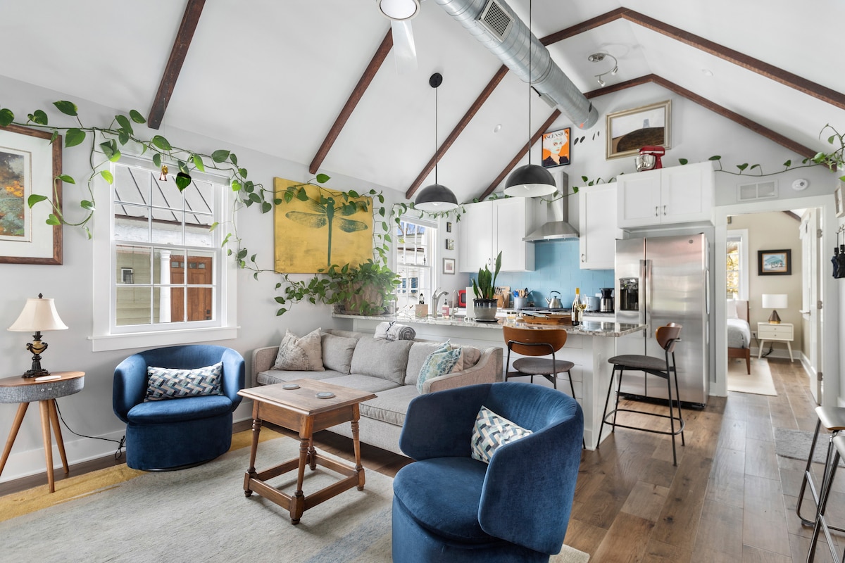Turn back time, in this historical home, downtown Charleston, waltzing across polished wood floors past huge sash windows in a period loft. Heritage colors, design, and a mix of new and traditional pieces like an old-fashioned writing bureau add to the grandeur of 12-foot ceilings and original fireplaces. Ideal for a Couple, on a romantic getaway or a girls weekend in the top city of Charleston. Private, spacious 1,000 sq. ft. Private, off-street Parking with EV charger. Permit: OP2024-05063