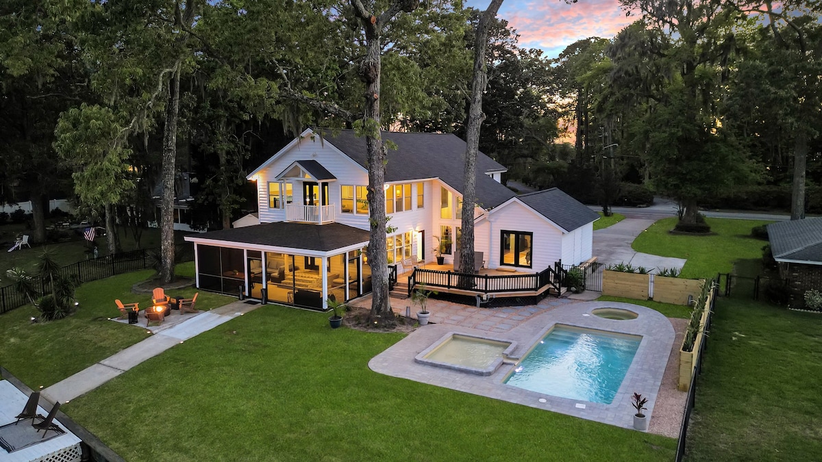 -Gorgeous lakefront panoramic view -12 mins to either downtown Savannah OR Tybee island -Tanning ledge spillover into pool -In-ground spa -Screened in porch steps from the water -Firepit -Gameroom / movie room with arcade console, pool table/airhockey, and dartboard -2nd Floor lounge with shuffleboard, bar, and balcony with best view on the lake -3 kings, 2 queens, 2 twin XL beds -1 queen conversion daybed -1 queen conversion sleeper sofa -2 full conversion plush cots -Roll away twin XL