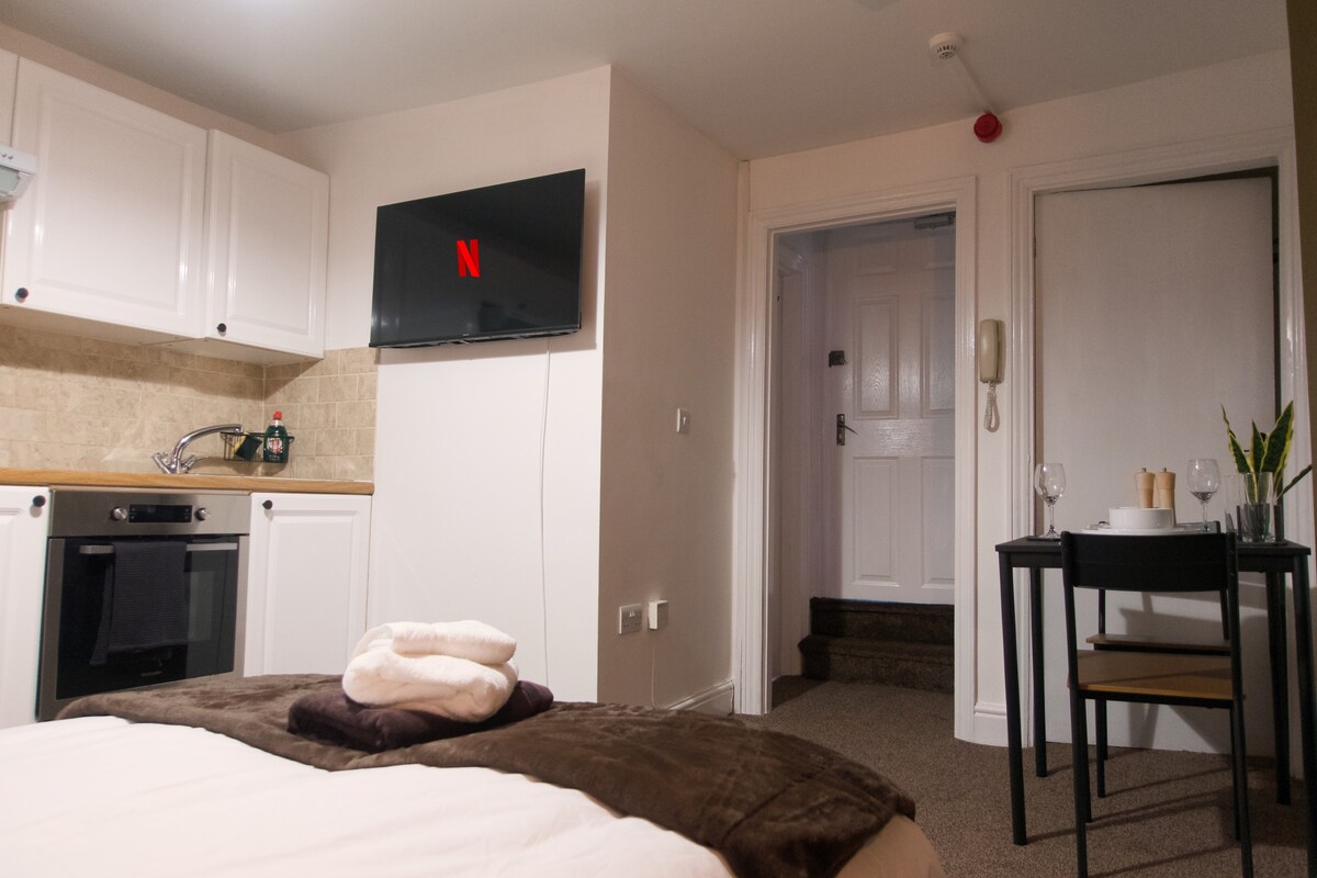 First floor refurbished flat accessible with lift, ideally situated a few steps away from the High Street and all commodities pubs restaurants shops. Very quiet flat days and nights (facing backyard). Modern and stylish kitchen with dining area. Sleeping arrangements: -Double bed with built-in wardrobes. -Living room with best quality convertible sofa. Free Wifi, large TV in the living room and bedroom with Netflix & Prime.