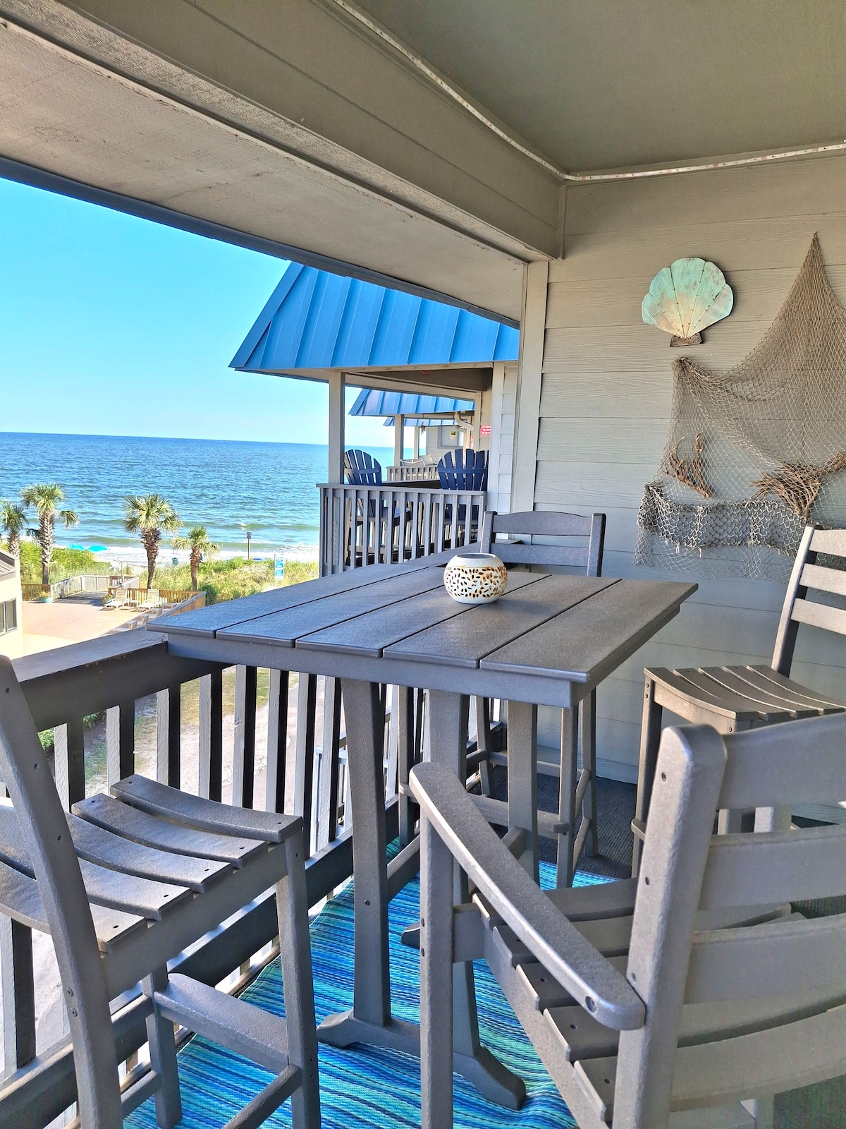 Oceanfront keyless entry condo with amazing full views off a spacious deck with a pool, and only steps to the beach. This beautifully decorated unit boosts a fully equipped kitchen with a large island, coffee bar, new bathrooms with luxury towels and ready made beds with Egyptian Cotton premium linens and bed quilts. Stackable washer/Dryer, living room has a 60 inch wall TV. Friday-Friday weekly rentals in summer season. Strict no pet policy.