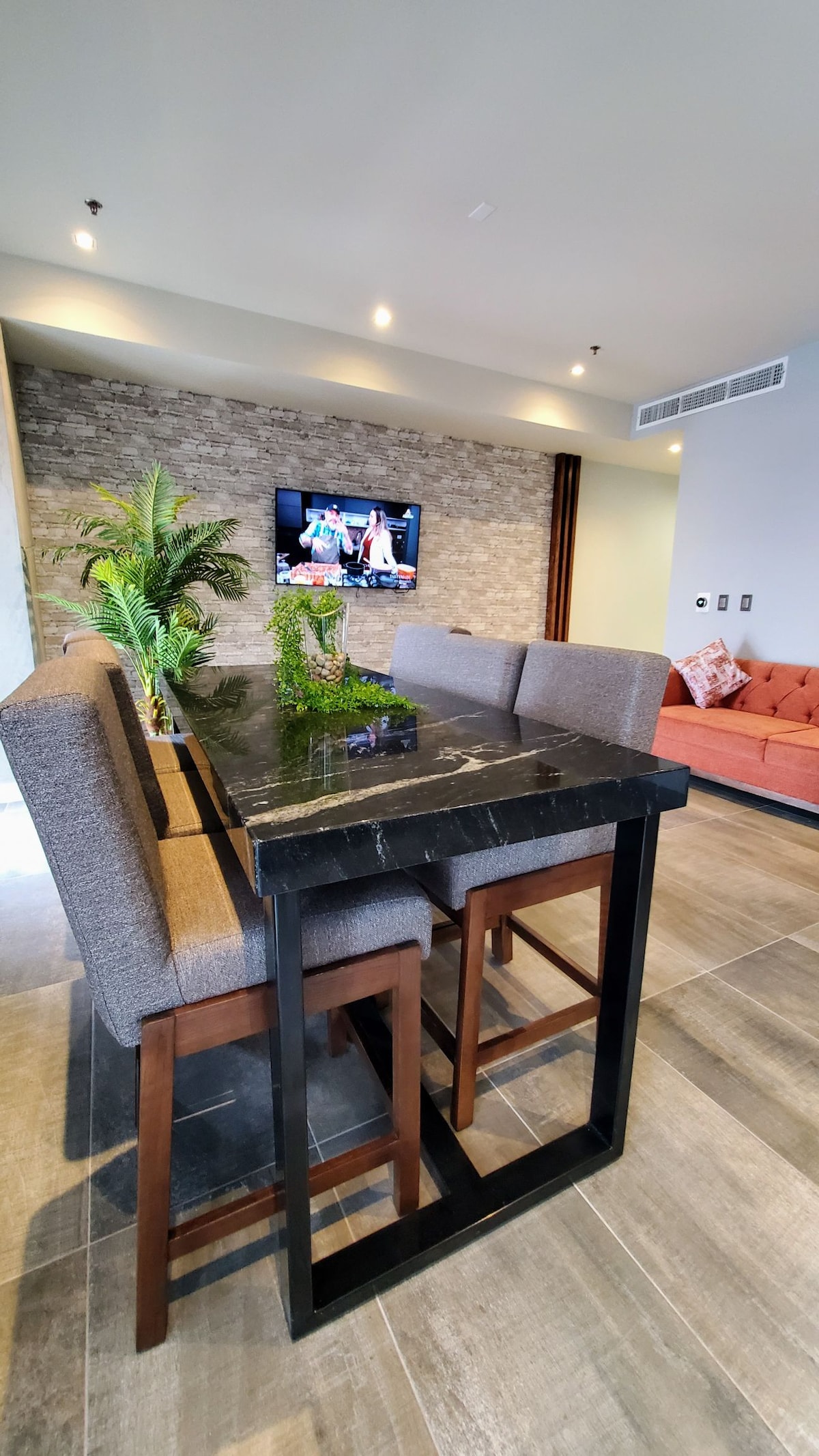 Executive apt with LUXURY FINISHES (CANTERA STONE & MACHIMBRE) in downtown CHIHUAHUA Balcony overlooking city center 75m2 PETS FORBIDDEN 2.5 blocks from iconic Angel and Hospital Central Safe zone. Fully furnished, minisplit cold/warm, air conditioning, 55-inch SAMSUMG tv, internet, magnetic induction stove, frets, desk, minibar, very comfortable sofabed, king size bed (NEZT mattress), rustic wardrobe. *NOTE: INVOICES ARE ISSUED UPON REQUEST. Ideal for foreigners, executives, or professionals.