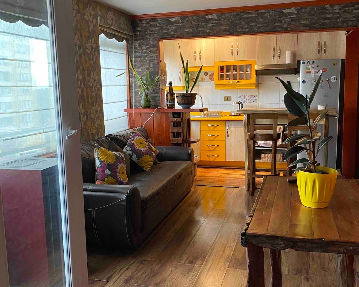 A pasos de la playa y todo lo que Reñaca y Viña te puede ofrecer. Espectacular vista desde todas las areas del loft. Con terraza para disfrutar el aire marino, tomar desayuno o tomar un trago viendo la puesta de sol. Ideal para dos adultos y dos niños (No incluye piscina)
