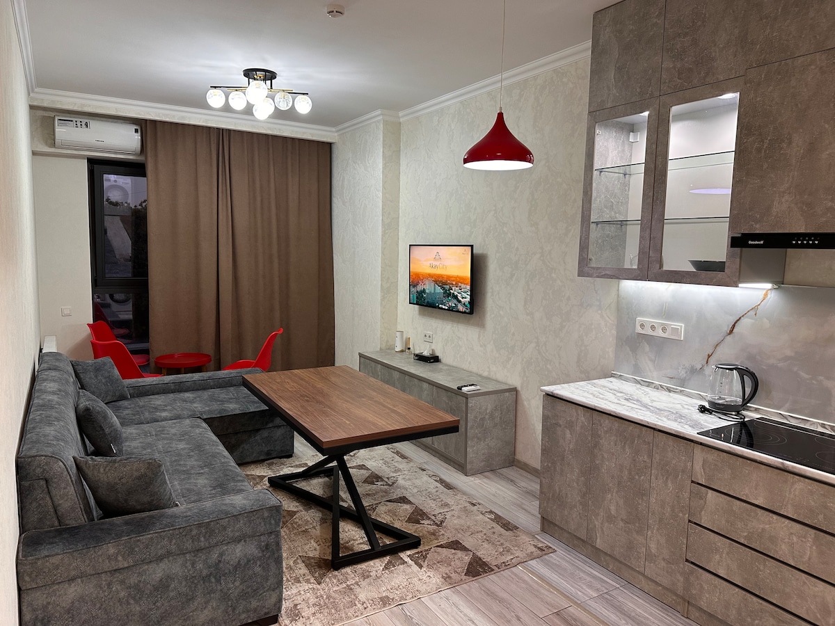 Welcome to your modern home away from home in the heart of Tashkent! This stylish 1-bedroom + den apartment at Akay City Residence offers comfort and convenience for both short and long stays. The apartment is fully furnished and features a king-size bed, a cozy living space with TV and free Wi-Fi, and a fully equipped kitchen where you can prepare your favorite meals. Perfect for families, solo travelers, or business guests looking for both relaxation and productivity.