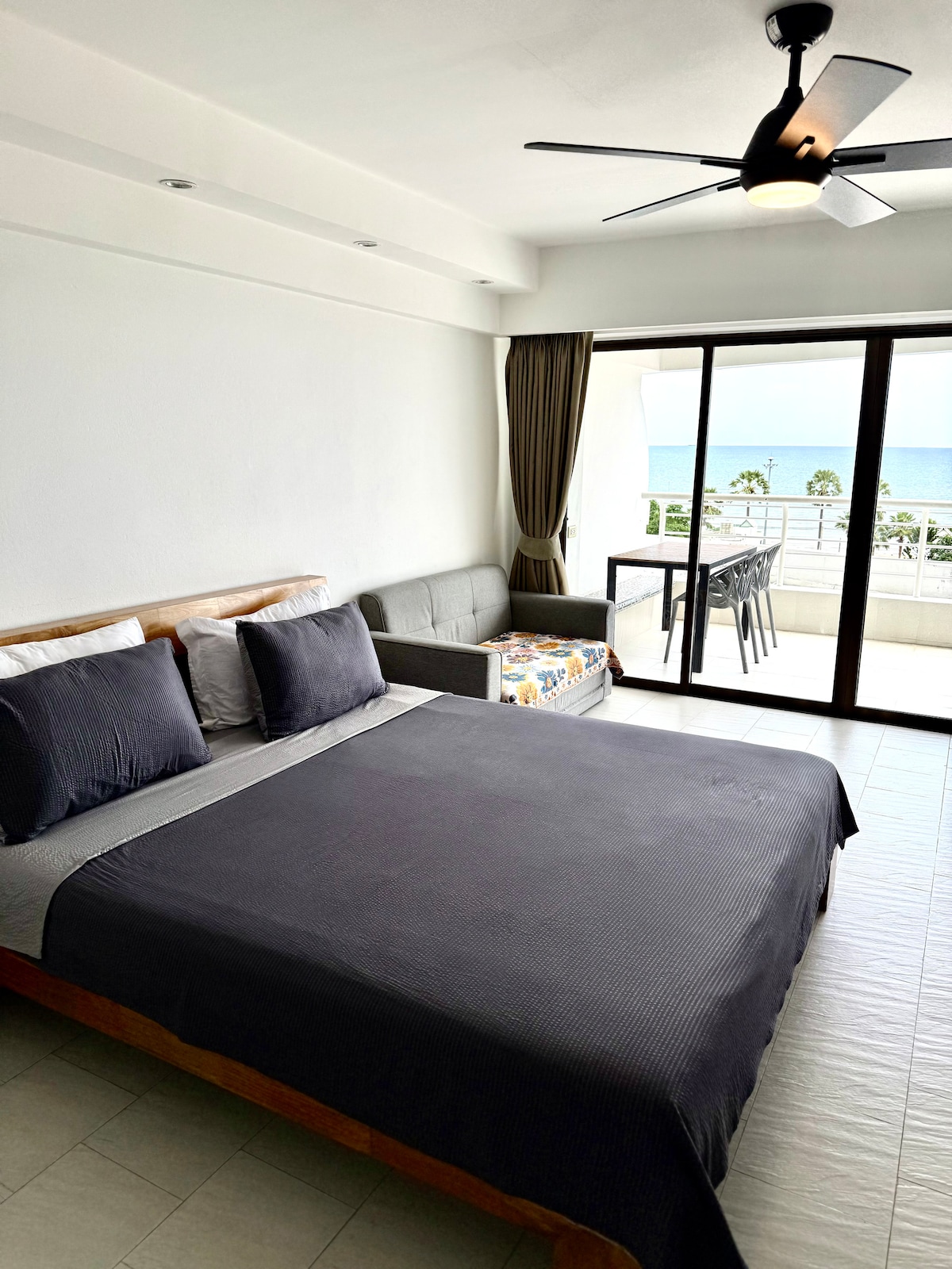 Experience the ultimate beachfront escape at our stylish "Sea Breeze" 58 sqm direct sea view studio in Jomtien Beach Pattaya, just a 1-minute walk from the sand and the new 5 star Marriot hotel. Perfect for singles and couples, this elegant condo combines comfort and modern design with luxury amenities. Step onto your private 12 sqm huge balcony and soak in a full, uninterrupted sea view. Check out our other condos in Pattaya listed on Airbnb: airbnb.com/h/ airbnb.com/h/oceanparadisef8