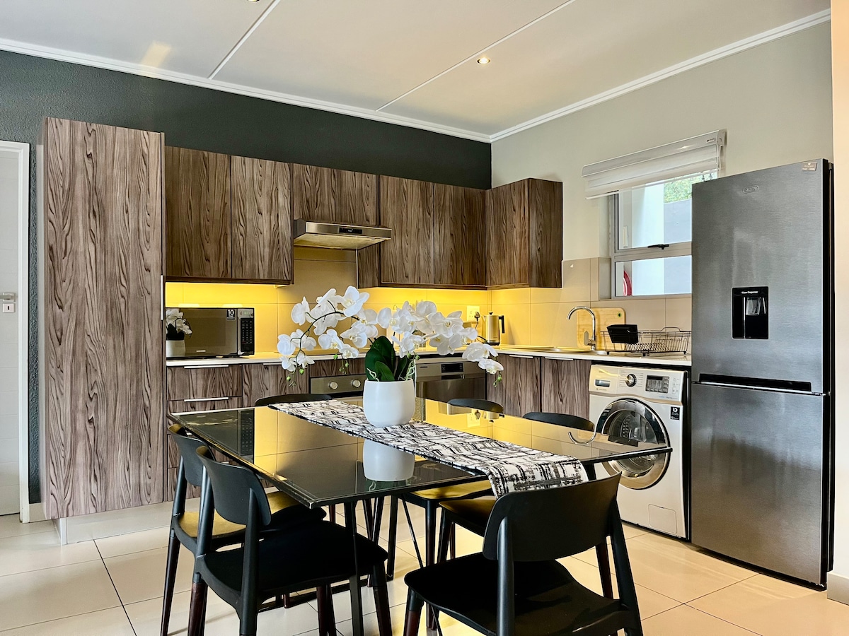 We welcome you to relax in our calm and luxurious space situated in a quiet section of Fourways. The apartment is uniquely and tastefully designed with amenities that radiate style and comfort. Treat yourself to this stunning apartment with a queen size bed, a fully equipped kitchen and a modern bathroom. Unwind on the patio or on the couch and enjoy a TV with Netflix and Youtube. The apartment has electricity backup that runs the TV and the Wi-Fi. Book your stay today and indulge in luxury.