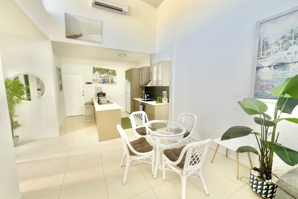 New, architect design, townhouse, heart of Caloundra, walking distance: beach, fishing, Bulcock St restaurants, shops, and attractions. King bedroom with ensuite and walk-in robe. Smart TVs, Prime, Foxtel, Paramount, MGM, Apple TV & free-to-air. Family and environmentally friendly, zero carbon footprint with 6.6 kw solar green energy. Private outdoor area with BBQ. Each bedroom has its own A/C heat & cool, and ceiling fan. Fully equipped kitchen with breakfast bar. Discounts 16% for week plus.