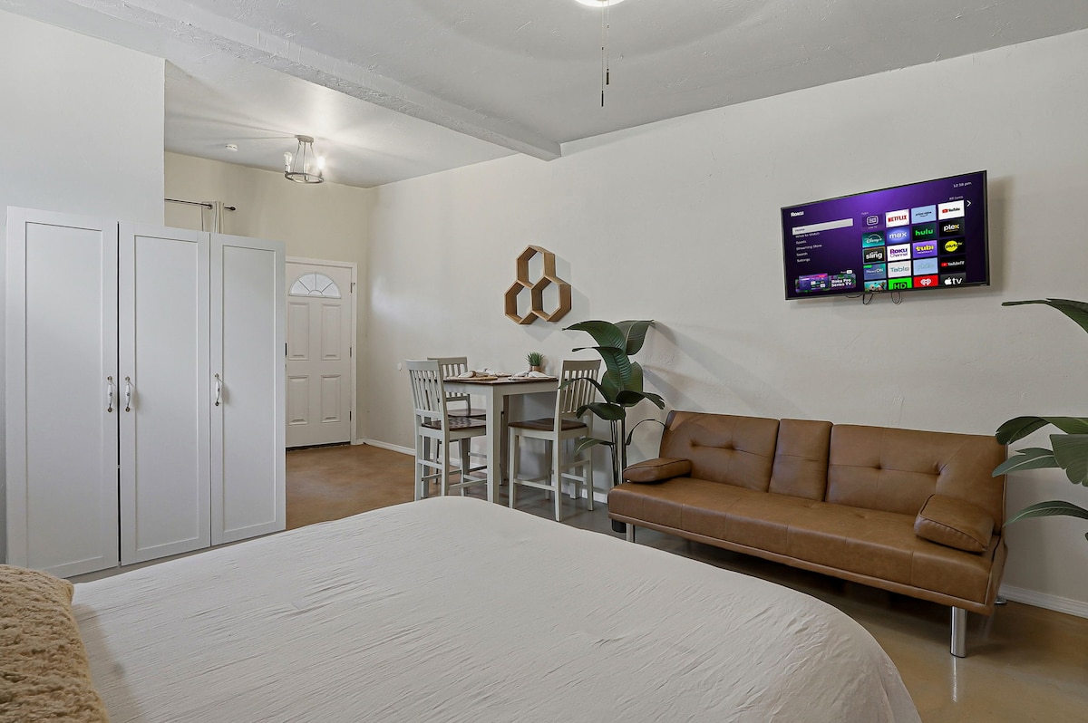 Come relax in a newly built studio with refrigerated air . This studio has an open floor plan with a queen size bed, full bath, kitchen, and private entrance; giving you all the necessities of home. This Studio is close to everything in town, and only few blocks from I-10. It's 10 minutes to the Airport, UTEP, Downtown and Fort Bliss not to mention walking distance to restaurant and bars . This space provides you WiFi and Roku TV. .NO PARTIES only registered guests allowed on the property.