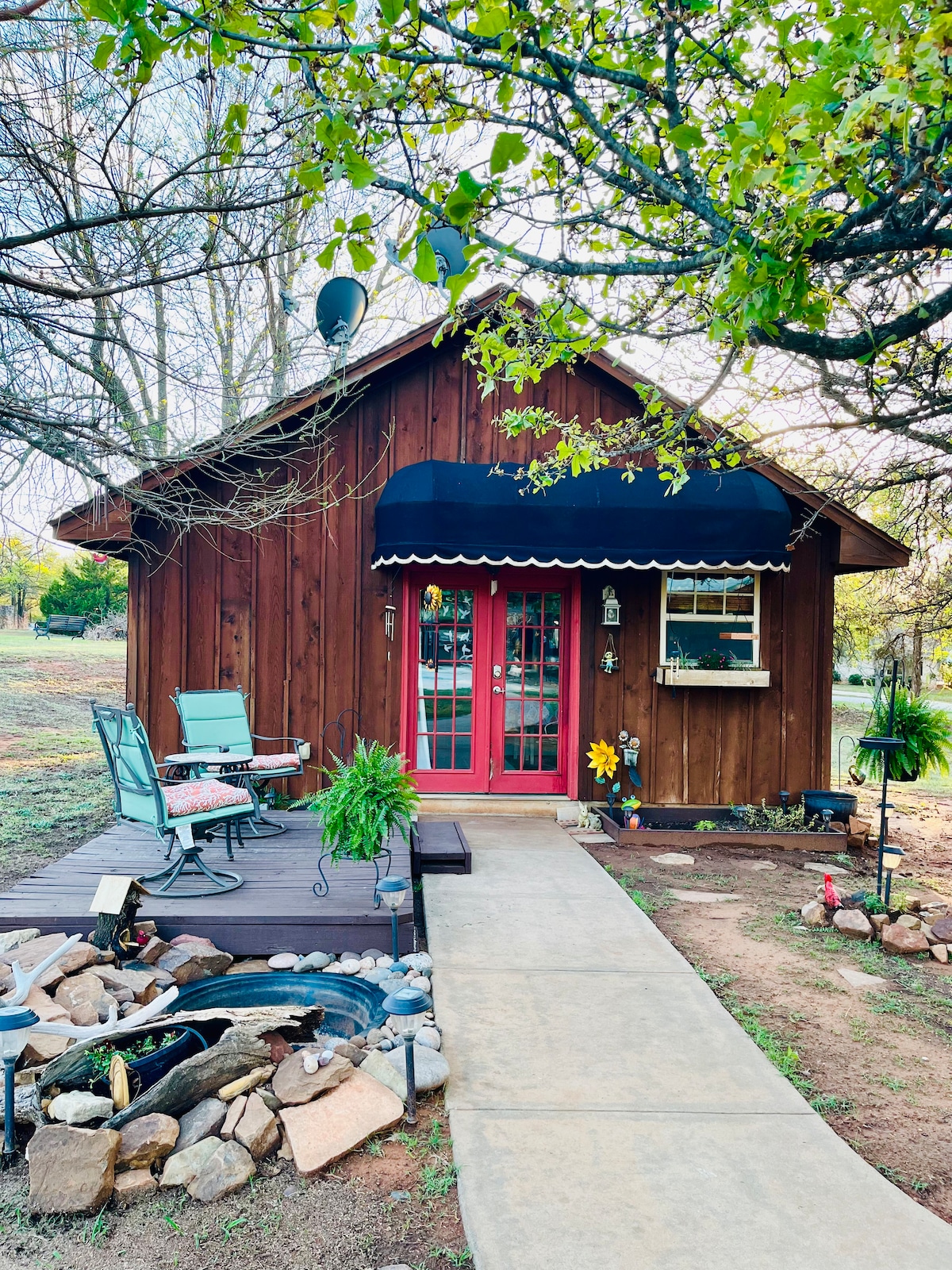 Tucked back behind the main house, this private newly remodeled studio creates a space to retire for rest and relaxation. Located less than a mile north of the University of Oklahoma campus and just a short walk to downtown Norman's restaurants and bars. This Bright and open-plan layout features a queen-size murphy bed, a sliding barn door, a kitchenette, 42 inch TV with Apple Play, and a private patio.
