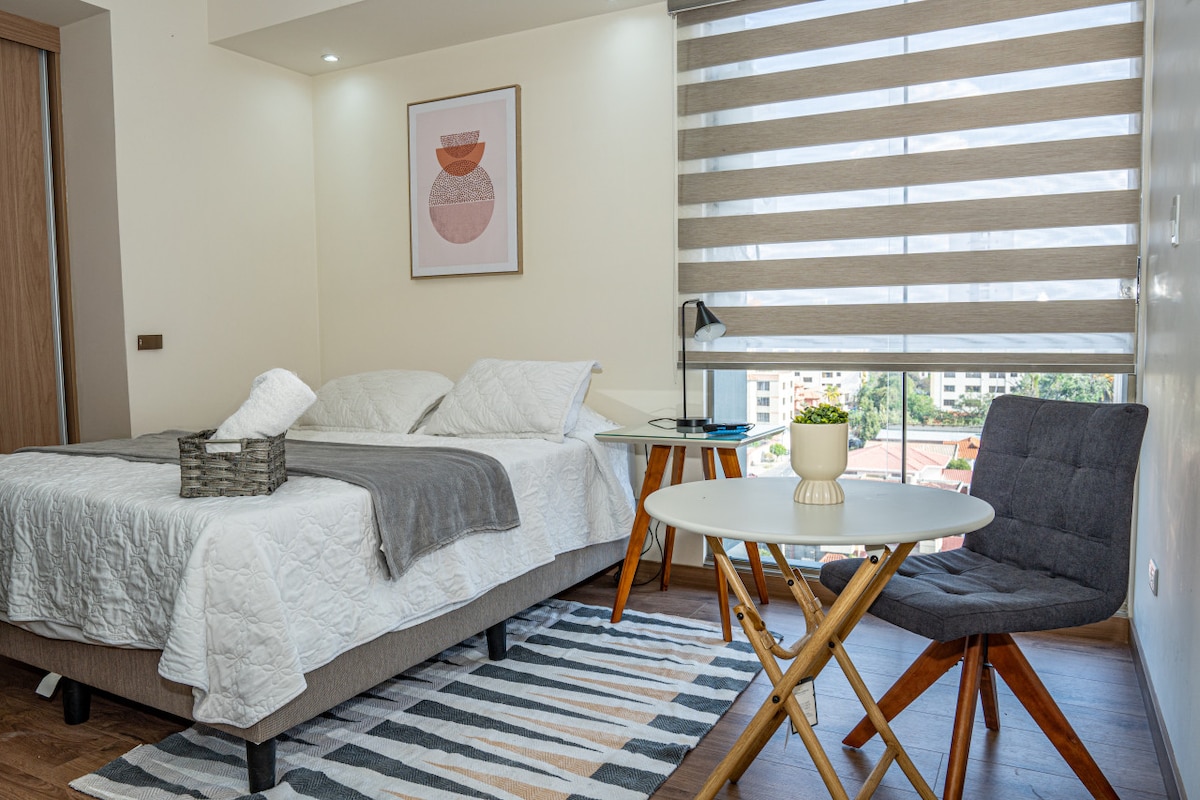 Descansa y disfruta en este moderno monoambiente, diseñado para brindarte confort y tranquilidad. Ubicado en una zona privilegiada, este espacio cuenta con todas las comodidades necesarias, incluyendo Smart TV, WiFi de alta velocidad, lavadora propia. Además, tendrás acceso a piscina (previa reserva), jacuzzi y sauna (pago por uso). Perfecto para viajes de negocios o escapadas a la ciudad. Disponible de parqueos para alquilar en el edificio.